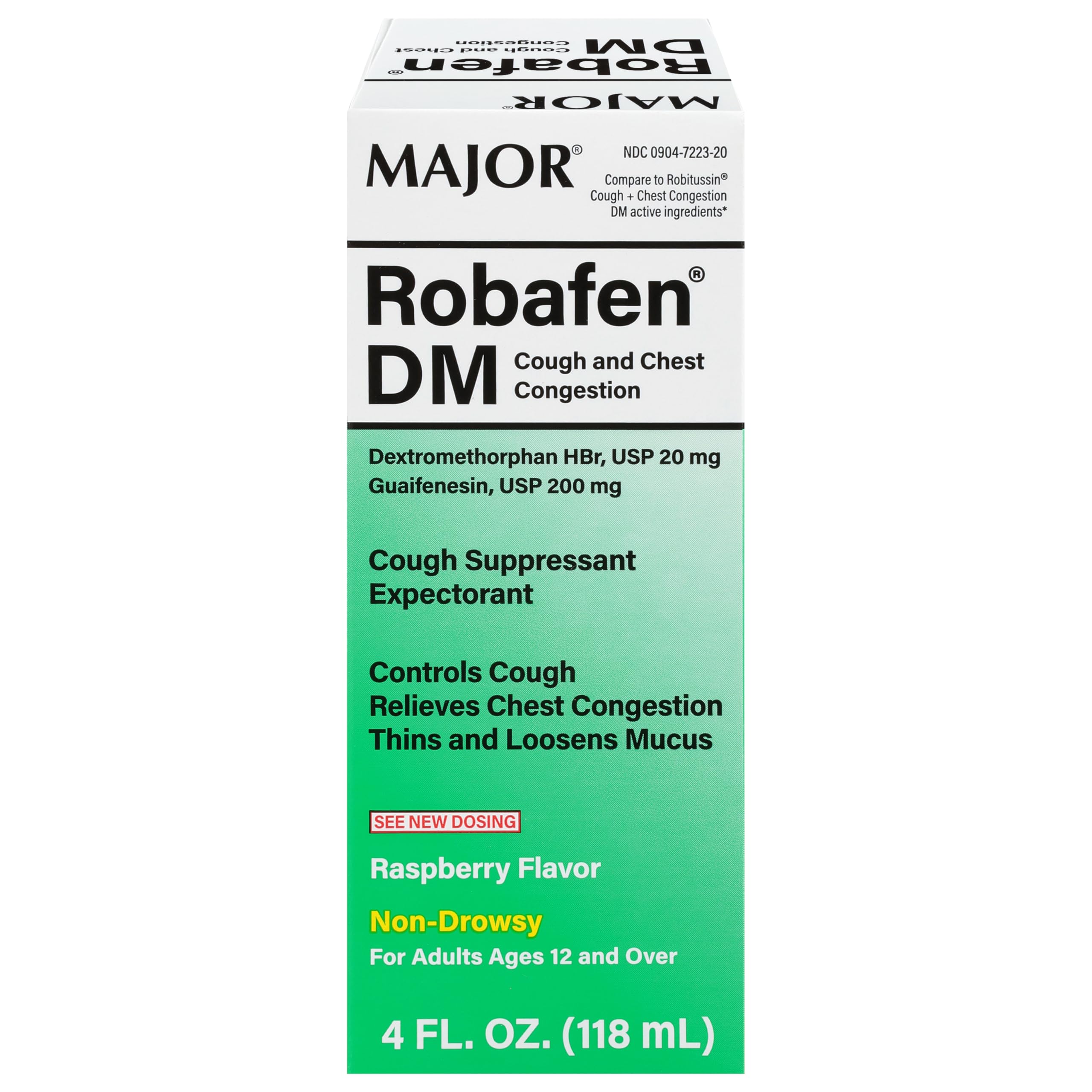 MAJOR PHARMACEUTICALS: At Major Pharmaceuticals, we believe wellness should be accessible to everyone. We pride ourselves on our legacy of delivering quality OTC and vitamin supplements. QUALITY FORMULATION: We maintain high standards of care through strict regulatory compliance to deliver carefully formulated cough suppressant liquid. HOW TO USE: Adults and children 12 years and older: take 20 mL every 4 hours. Children under 12 years: do not use. Do not take more than 6 doses in any 24-hour period. ACTIVE INGREDIENTS: Each 20mL of this cough medicine liquid contains 200mg of guaifenesin as an expectorant, and 20mg of dextromethorphan HBr as a cough suppressant. CHEST CONGESTION RELIEF AID: Major Robafen DM may help temporarily relieve cough due to minor throat and bronchial irritation as may occur with a cold. It helps loosen phlegm (mucus) and thin bronchial secretions to drain bronchial tubes.