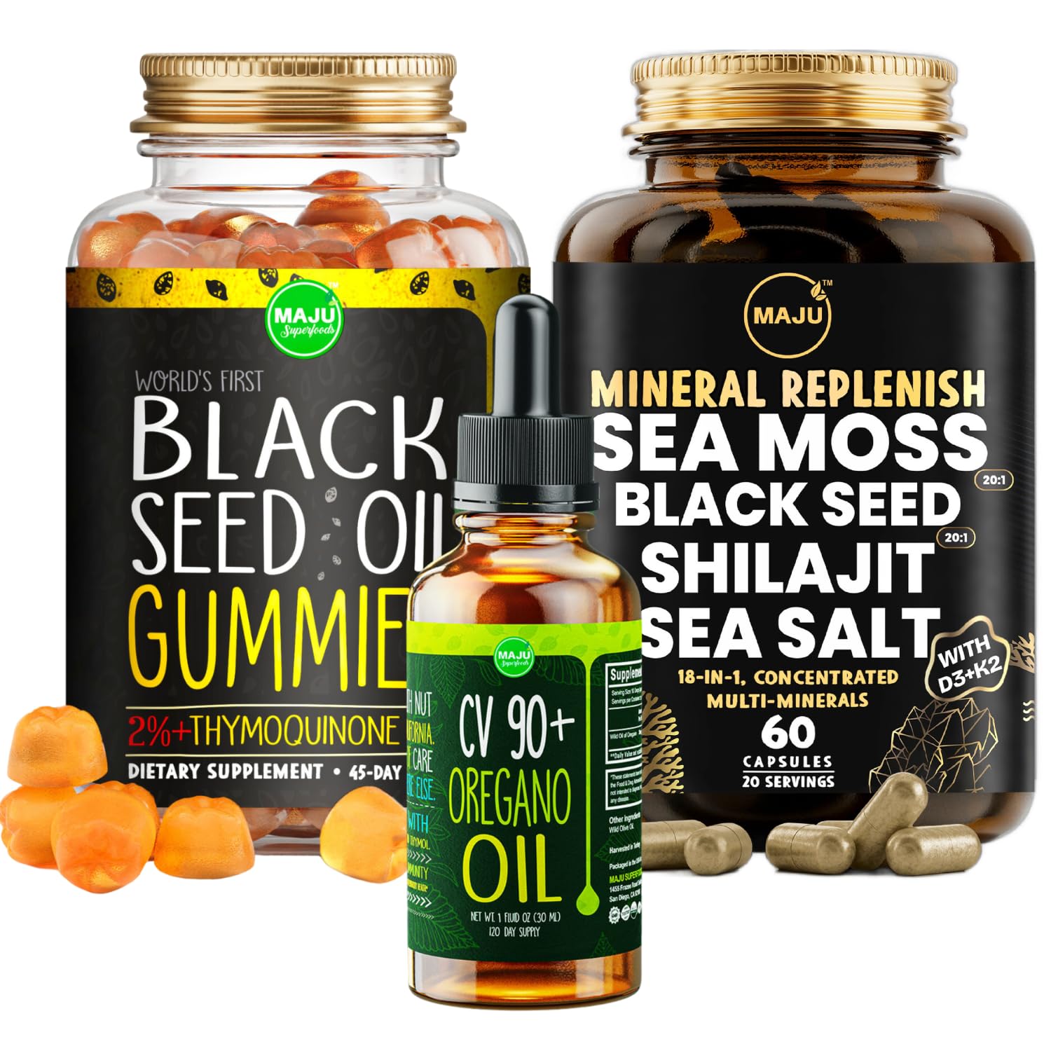 Maju's 18-in-1 Mineral Replenish Capsules (60 ct). Maju's High Carvocrol Oregano Oil (1 oz). Maju's Tasty Black Seed Oil Gummies (90 ct).