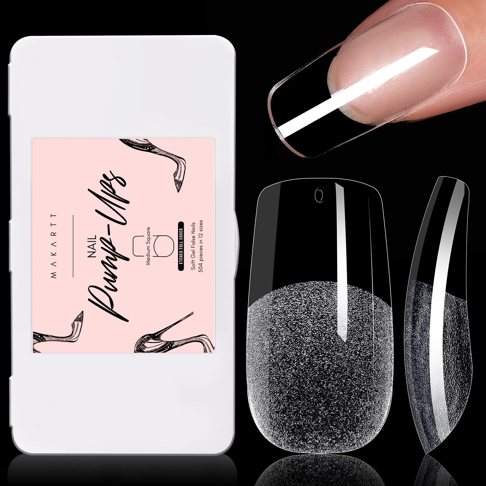 Makartt 504Pcs Soft Gel Nails Pre-buff Full Cover Nail Tips Medium Square False Gelly Tips Press on Nails Matte Fake Nail Clear Acrylic Nails No Crease 12 Sizes Nail Supplies for Salons DIY Nail Art