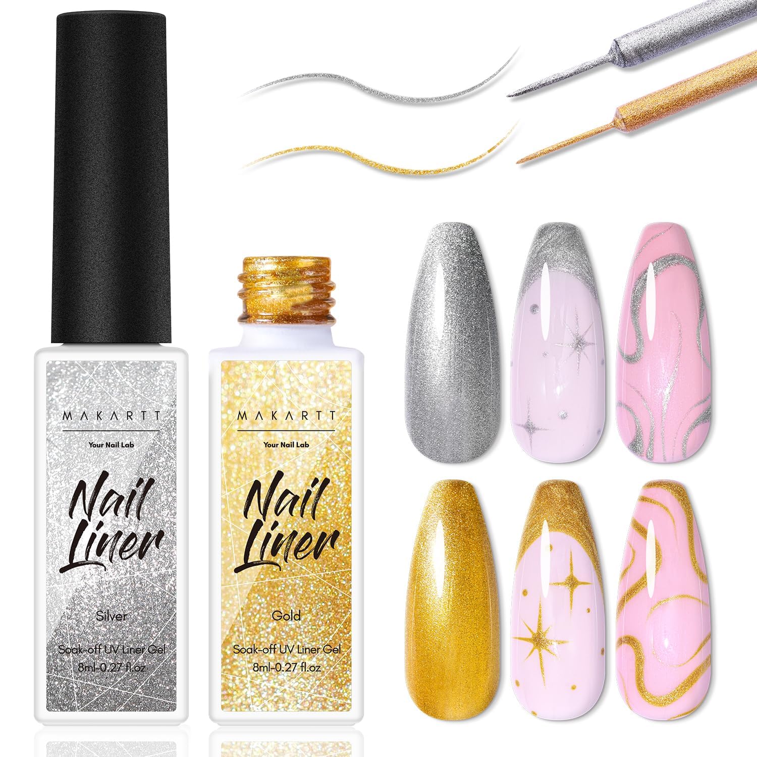 ?Ideal for All Occasions and Skill Levels?:Whether you're preparing for a special event or just enhancing your daily look,our versatile Glitter Silver and Gold Gel Liner Nail Polish is perfect.It's also an excellent gift for nail art lovers looking to expand their creative toolkit with high-quality,versatile products. ?Environmental & Healthy?:The 2pcs 8ml classic silver and gold liner gel polish formula is proudly vegan and we do not conduct animal testing. And Makartt soak off nail art gel liner painting polish set is made of environment-friendly formula,low odor, no harm to skins and nails. ?Quick-Drying for Efficient Use?:Our gel liner is formulated for efficiency,drying quickly under UV or LED lamps.This feature allows for a faster manicure process,enabling both nail art enthusiasts and professional technicians to achieve precise,clean lines without the wait,making it an essential tool for busy schedules. ?Long-Lasting?::Achieve salon-quality results with Makartt durable gel liner nail polish that resists chips and smudges.Designed to last for weeks,this gel liner polish maintains a vibrant and shiny finish,ensuring your manicure looks freshly applied throughout its wear,without the need for frequent touch-ups. ?2024 CLASSIC Nail Art Gel Set?:Striking Glitter Finish,Elevate your nail art with our Glitter Silver and Gold Gel Liner Nail Polish.This set offers a mesmerizing metallic finish that adds sparkle and shine to any look.Perfect for detailed designs and accents,the precision brush ensures flawless application every time,ideal for creating stripes,dots,and intricate patterns.