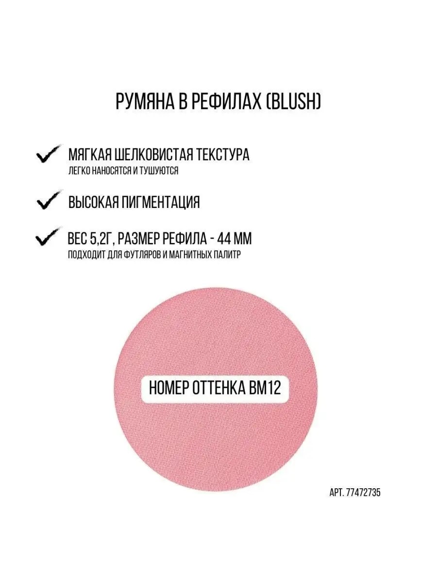 Dry face blush in refills. The blush has a soft, silky texture and rich colors. A rich palette of blush shades allows you to use it for makeup of any type of appearance. Blush weight 5.2g, refill size 44 mm. Suitable magnetic palettes: ARTICLE: 53911099, 53981931, 53982167. Suitable cases for refills: ARTICLE: 71878413 (for 5 refills), 71864767 (for 2 refills).