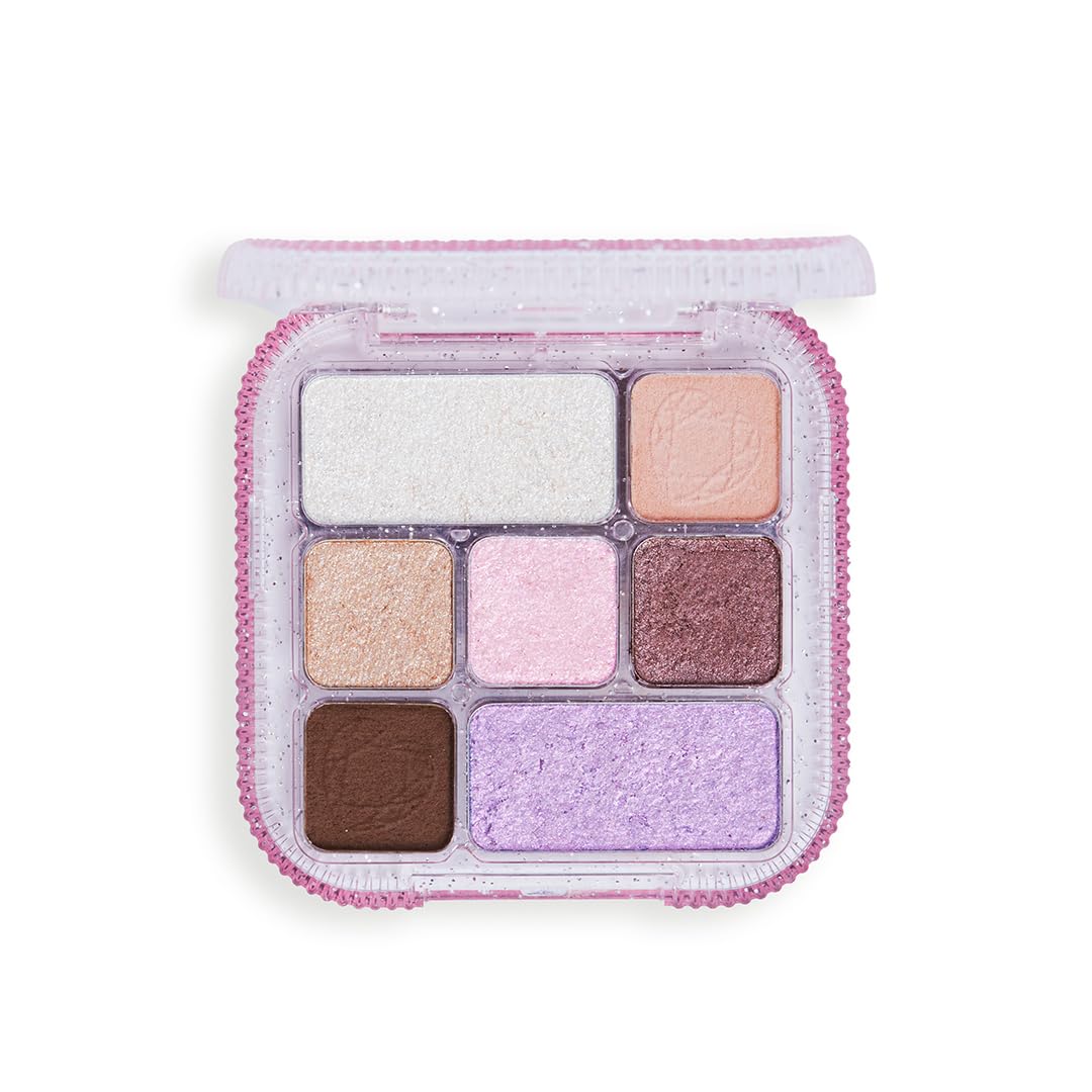 Revolution's 00's Angel Eyeshadow Palette. This Y2K-inspired eyeshadow palette contains seven ultra-creamy, multi-chrome matte and shimmer shades, all in an innovative, creamy, mousse-like texture for a buttery blend that delivers stunning color payoff on the eyelids. Presented in a glittery, transparent case for the final nod to the new millennium. Time to smile! They're perfect on their own or layered with your favorite eyeshadows. 2 x 1.5g 5 x 0.8g Cruelty-Free Vegan.