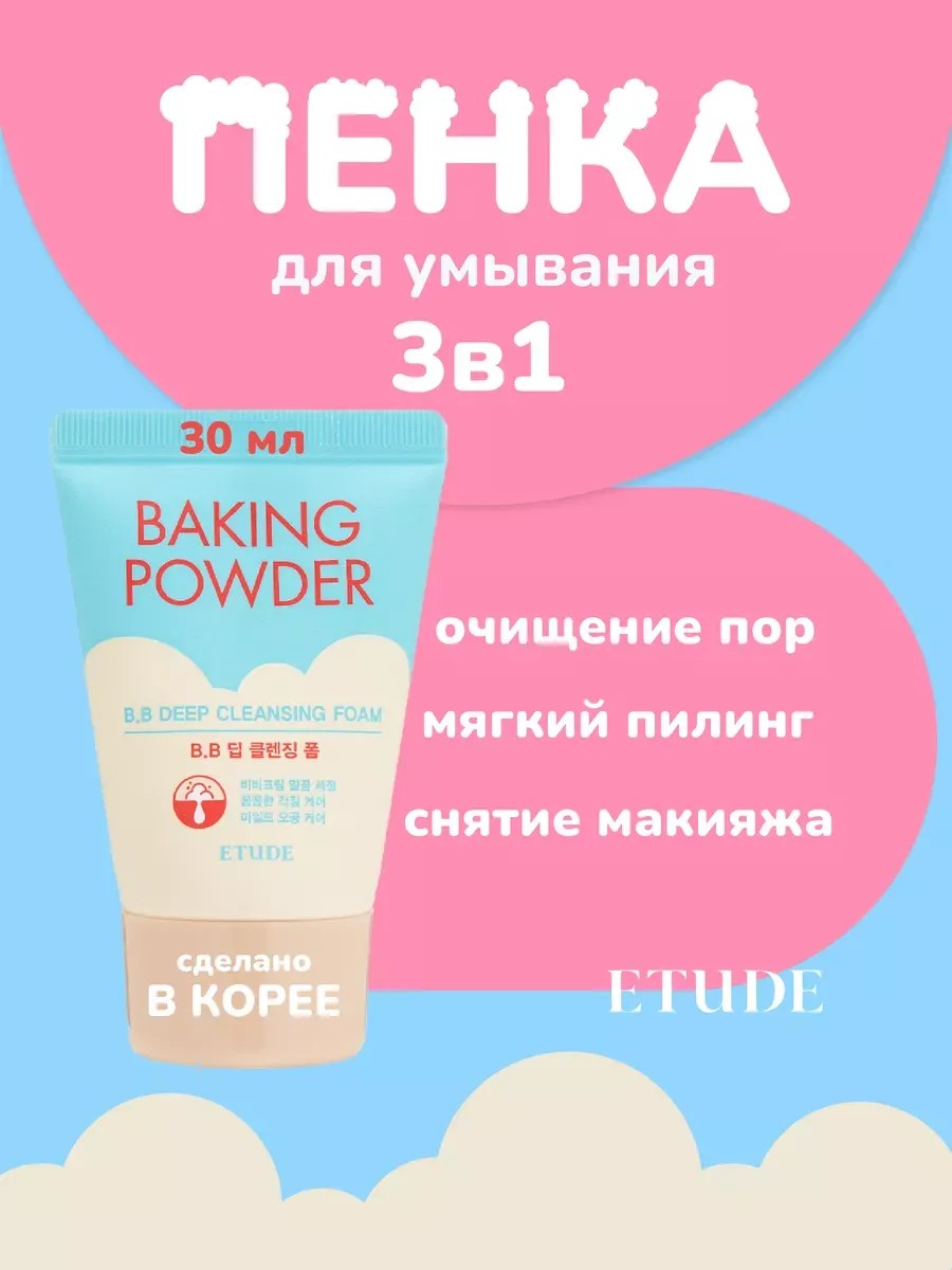 Корейская пенка для умывания лица содовая ETUDE предназначена специально для деликатного, но глубокого очищения кожи. Пена для лица имеет уникальный состав, в который входит сода: именно из-за нее продукт имеет название Baking Powder и стал настоящим хитом на рынке. Содовая пенка для умывания лица совмещает сразу несколько функций: это очищающая пенка для лица, профилактическая умывалка от прыщей и эффективное средство для снятия макияжа. Пенка рекомендована для регулярного применения: ежедневно для склонной к жирности кожи и несколько раз в неделю для комбинированной или сухой кожи. ETUDE Baking Powder B.B Deep Cleansing Foam разработана именно как пена для снятия макияжа с усиленной формулой, направленной на удаление остатков тонального крема, bb-крема, пудры и других декоративных продуктов. Корейская пенка для умывания лица не только стирает внешний слой макияжа, но и проникает глубже в поры. Обычные гели и пенки не могут расщеплять остатки декоративных продуктов в порах, что приводит к черным точкам и тусклости кожи, но пенка для умывания с формулой B.B Deep Cleansing решает эту проблему. Сода в составе пенки дает эффективное глубокое очищение лица, вытягивая из пор остатки косметики, забившийся себум и другие загрязнения. Тщательное умывание лица помогает бороться с черными точками и воспалениями. Очищение с содовой пенкой эффективно и от прыщей: сода подсушивает активные воспаления и быстро выводит гной. Очищающая пенка для лица с содой не воздействует на кожу слишком агрессивно благодаря бетаину в составе. Это увлажняющий компонент, благодаря которому сода не разрушает защитный барьер кожи и не вредит ей. Корейская пена для умывания ETUDE HOUSE содержит также рисовые отруби. Они помогают восстанавливать целостность структуры кожи и выравнивать ее микрорельеф. За счет регенерирующих функций рисовых отрубей умывалка от прыщей не только убирает воспаления, но и обновляет кожу, возвращая ей естественную красоту и гладкость.