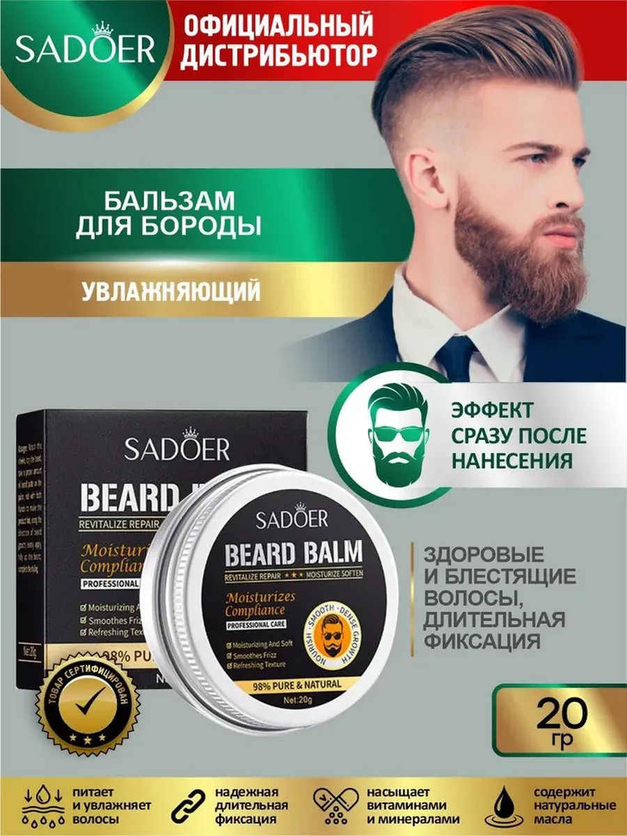 Sadoer Men's Moisturizing Beard Balm, 20g. This men's beard balm is essential for styling and shaping your beard. Simply apply a small amount to hold and smooth hairs in the desired direction. The balm doesn't weigh hair down or leave a greasy residue, absorbing quickly and firmly holding hairs in place. It creates a matte finish and gives your beard a well-groomed look.