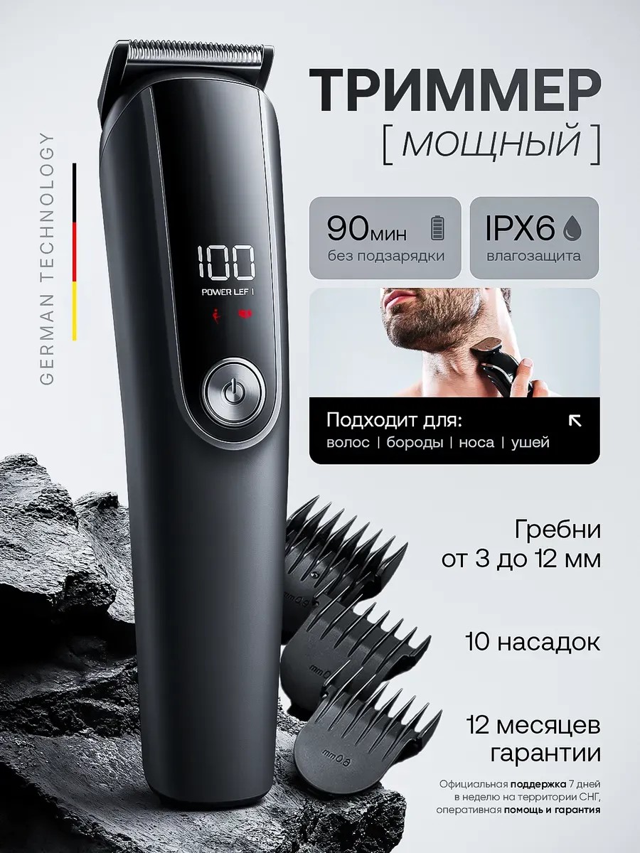 | Package Contents | Men's shaving trimmer; Set of removable blades - 5 pcs.; Combs - 4 pcs.; Cleaning brush; Trimmer oil; USB Type-C charging cable; Organizer for attachments; Manual in Russian |