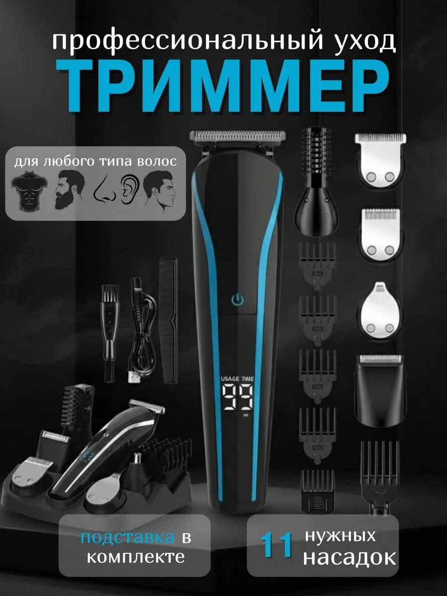 Триммер 11 в 1 - это многофункциональное устройство, которое подойдет для стрижки волос на лице, в ушах, носу и даже на теле. В комплекте идут 11 насадок, которые позволяют стричь волосы, подравнивать усы и бороду, а также создавать уникальный образ в домашних условиях.