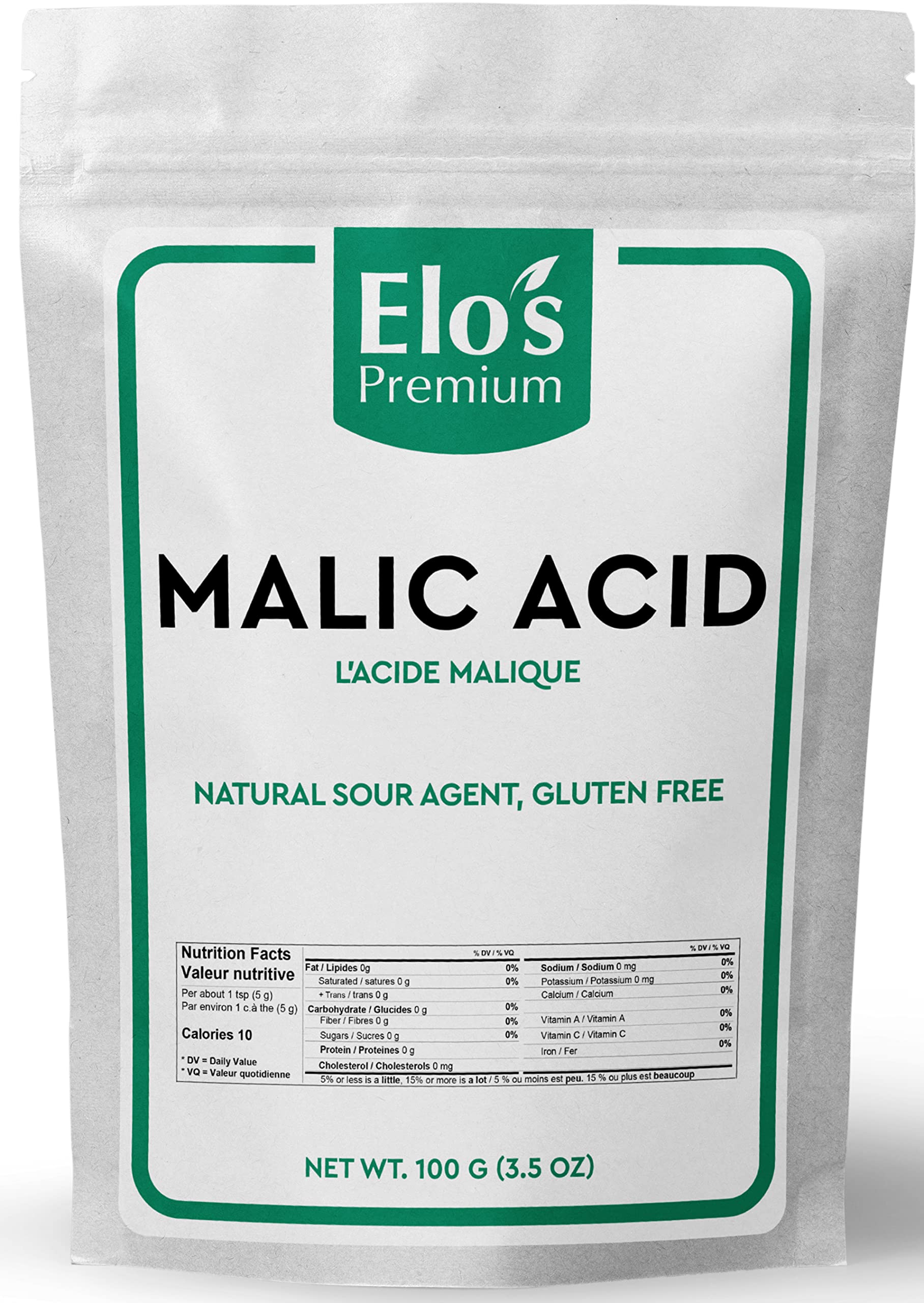 Malic Acid Powder by Elo s Premium (100 g) Packaged in CANADA Gluten Free Food Grade Natural Sour Agent for Candy Wine Potato Chips Recipes and More