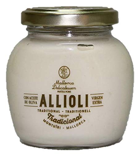 Olive Allioli Virgen Extra and Garlic This combination creates a characteristic sauce with a creamy texture, developed with appreciation and according to old customs, which could make this sauce an indispensable accessory of the Mediterranean catering industry.Mallorca Delicatessen, Allioli, traditionele olijfolie, extra, 170 g Olive Allioli Virgen Extra en Knoflook Deze combinatie creëert een karakteristieke saus met romige textuur, die met waardering en volgens oude gewoonten is uitgewerkt, die deze saus tot een onmisbaar accessoire van de mediterrane horeca kon maken.