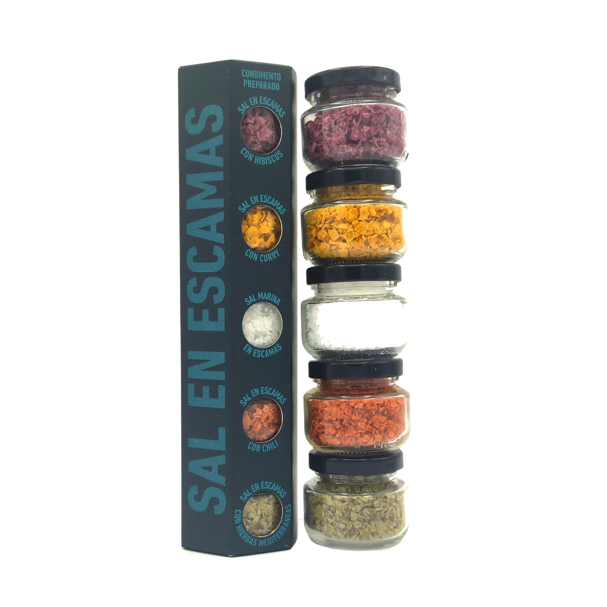 Glosa Marina Gourmet Salt Flakes Set of 5 Majorcan Sea Salts (5 x 30g) ? The perfect tasting set, composed of the finest sea salt and delicious flaked spices. Whether as a birthday gift, for Christmas, for moving into a new apartment or house, or simply for a loved one, it's always the ideal gift from Majorca and Spain. Easily enhance your food such as pasta, tapas, grilled meats, salads, sauces, and more with the Sal en Escamas varieties from GLOSA MARINA. This beautiful box from GLOSA MARINA contains the following salts: Sal en Escamas with Hibiscus - Sea salt flakes with hibiscus. Ingredients: Sea salt flakes 95 , hibiscus flowers 4 , red bell pepper Sal en Escamas con Curry - Sea salt flakes with curry Ingredients: Sea salt flakes 95 , curry 5 (turmeric, clover, corn starch, cloves, salt, cumin, cayenne pepper) Sal Marina en Escamas - Natural sea salt flakes Sal en Escamas con Chili - Sea salt flakes with chili pepper Ingredients: Sea salt flakes 96 , chili pepper, cayenne pepper, smoked bell pepper Sal en Escamas con Hierbas Mediterraneas - Sea salt flakes with Mediterranean herbs Ingredients: Sea salt flakes 95 , aromatic herbs 5 (rosemary, oregano, parsley, cumin, fennel), garlic This sea salt is sun-dried in Mallorca. Gourmets worldwide appreciate its distinctive flavor. Net weight: 150g Packaging: in five attractive, decorative, resealable 30g jars (disposable) Storage instructions: Store in a cool, dark placeGLOSA MARINA Sal en Escamas Gourmet Sel, sel de mer et épices en flocons de Majorque Espagne, le coffret cadeau idéal (5 x 30 g)DESCRIPTION DU PRODUIT Glosa Marina Sal en Escamas Gourmet Lot de 5 sels de mer de Majorque (5 x 30 g) ? Le kit de dégustation parfait, composé du meilleur sel de mer et de délicieuses épices en forme de flocons. Que ce soit comme cadeau d'anniversaire, pour Noël, pour emménager dans un nouvel appartement ou une nouvelle maison ou tout simplement pour un être cher, toujours le cadeau idéal de Majorque et d'Espagne. Affinez facilement vos aliments tels que les pâtes, les tapas, les grillades, les salades, les sauces, etc. Avec les variations Sal en Escamas de GLOSA MARINA. Cette magnifique boîte de la marque GLOSA MARINA contient les sels suivants : Sal en Escamas con Hibiscus - Flocons de sel de mer avec hibiscus. Ingrédients : flocons de sel de mer 95 , fleurs d'hibiscus 4 , poivron rouge Sal en Escamas con Curry - Flocons de sel de mer avec curry Ingrédients : flocons de sel de mer 95 , curry 5 (curcuma, trèfle à corne, amidon de maïs, clous de girofle, sel, cumin, poivre de Cayenne) Sal Marina en Escamas - Flocons de sel de mer naturel Sal en Escamas con Chili - Flocons de sel de mer avec piment. Ingrédients : flocons de sel de mer 96 , piment fort, poivre de Cayenne, poivron fumé Sal en Escamas con Hierbas Mediterraneas - Flocons de sel de mer avec herbes méditerranéennes Ingrédients : flocons de sel de mer 95 , herbes aromatiques 5 (romarin, origan, persil, cumin, fenouil), ail Le sel de mer est séché non traité au soleil de Majorque. Les gourmets du monde entier apprécient son goût particulier. Contenu (quantité nette) : 150 g. Mise en bouteille : dans cinq beaux bocaux décoratifs refermables de 30 g chacun (jetables) Conseil de conservation : conserver dans un endroit frais, à l'abri de la lumière