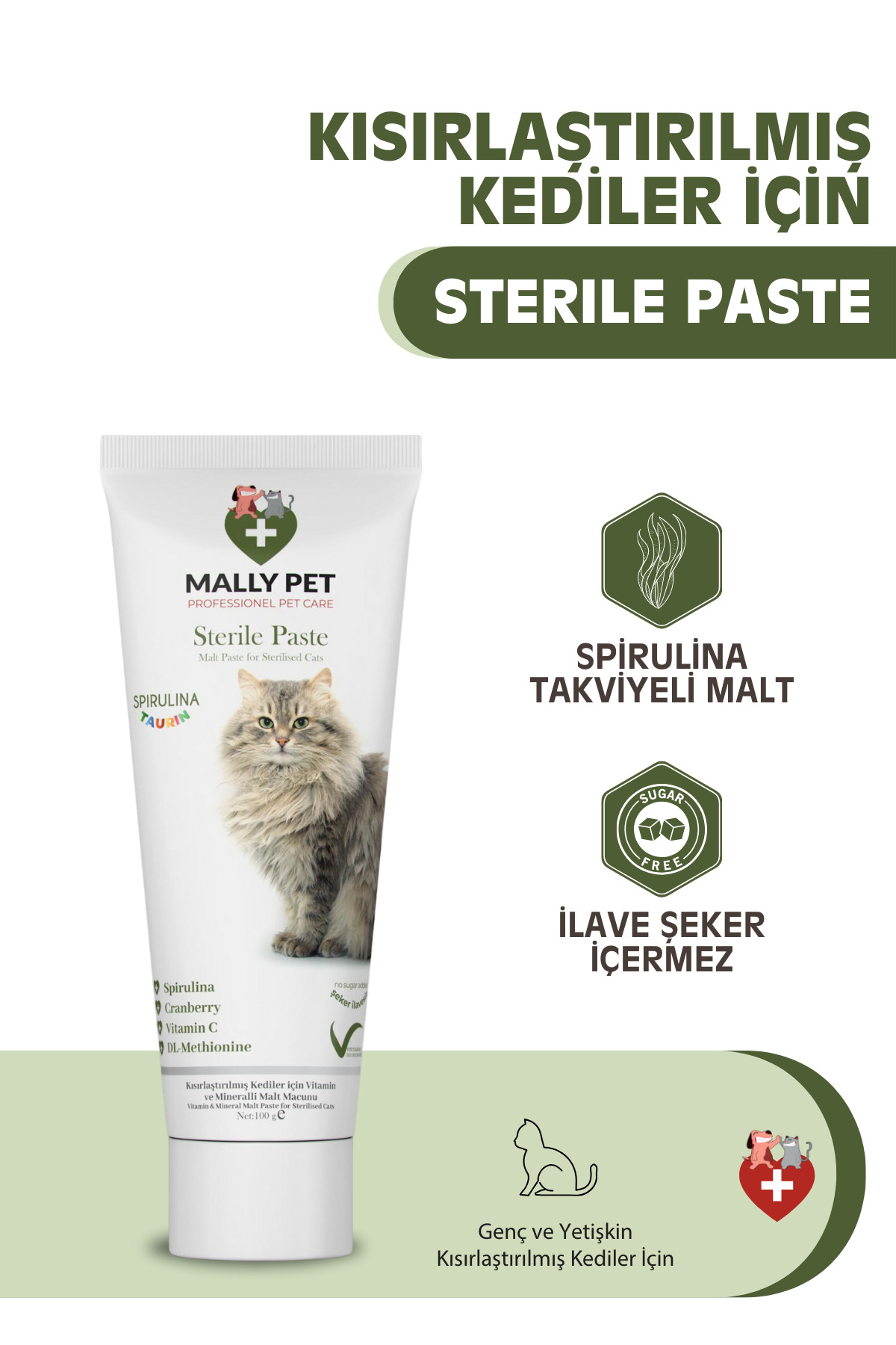 MALLY PET Kisirlastirilmis Kedilere Özel Steril Malt Macunu, kedinizin yuttugu tüyleri sindirerek vücuttan atilmasini saglarken, bagisiklik sistemini destekler. Içerigindeki 7 vitamin ve taurin, kisirlastirilmis kedilerin günlük ihtiyaçlarini karsilar. DL-Methionine , yaglarin metabolik olarak yakilmasini hizlandirarak kedinizin saglikli kalmasina yardimci olur. Cranberry ekstresi ise üriner sistem sagligini destekler ve idrar yollarinda kristal olusumunu önlemeye yardimci olur.