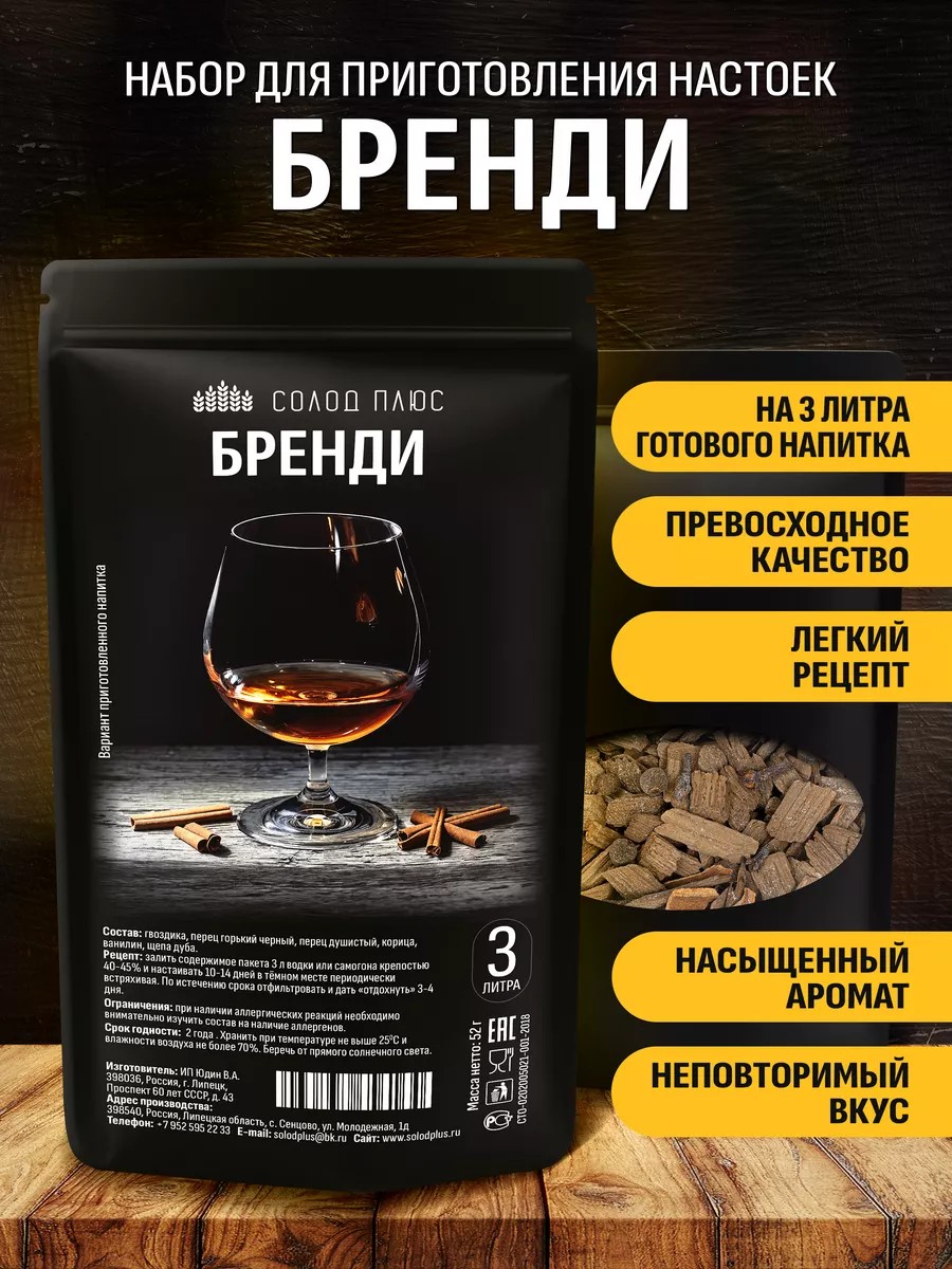 Бренди - один из популярных крепких алкогольных напитков, который может похвастаться многовековой историей. Янтарный цвет, насыщенный вкус и аромат по праву делает эту настойку роскошной. Традиционно бренди подают в снифтерах, нагревая в ладони для максимального раскрытия вкуса. Напиток подходит как в роли аперитива, так и дижестива. В качестве закуски рекомендуются мясные блюда, сыры, оливки, шоколад и фрукты.Настойка Бренди для самогона – это прекрасный способ придать напитку уникальный вкус и аромат. Набор ликеров, состоящий из перцев, гвоздики и других душистых специй, станет отличным подарком для любого винокура или самогонщика. Самогоноварение — это не только процесс получения алкоголя из сырья, но и возможность экспериментировать со вкусами. В этом поможет щепа дуба: она придаст напитку особенную гладкость и насыщенность. Для тех, кто предпочитает более ягодные или фруктовые ноты есть настойка "Бренди". Солод Плюс вы можете ожидать только качественного продукта. Эта компания заботится о своих клиентах, предлагая широкий выбор товаров для самого разнообразного использования. Важно учесть, что такие настойки можно использовать не только для самогона. Они прекрасно подходят и для обычной водки! Как результат вы получите алкогольный напиток с новым интересным вкусом. Ключевое слово здесь - экспериментирование! Вы можете создать свой собственный коктейль, добавив в него настойку. Это может быть что-то простое, например, водка с настоем гвоздики или перца. Или же вы можете создать что-то более сложное и экзотическое. Настойки для самогона — это отличный подарок не только для мужчин (мужа, друга), но и для женщин (жены, девушки). Представьте радость вашего близкого человека при получении такого оригинального и интересного подарка! В зависимости от того какую настойку вы выберете она будет подходить для разных времён года. Например, ликер из горячих специй будет хорошим выбором зимой, а легкая фруктовая настойка понравится вам летом. Спешите приобрести эти уникальные продукты! В составе такого набора могут быть необычные специи, такие как черный перец горошком. Они добавят вашим напиткам особый пикантный вкус и аромат.Состав: гвоздика, перец горький черный, перец душистый, корица, ванилин, щепа дуба.Рецепт: залить содержимое пакета 3 л водки или самогона крепостью 40-45% и настаивать 10-14 дней в тёмном месте периодически встряхивая. По истечению срока отфильтровать и дать «отдохнуть» 3-4 дня.