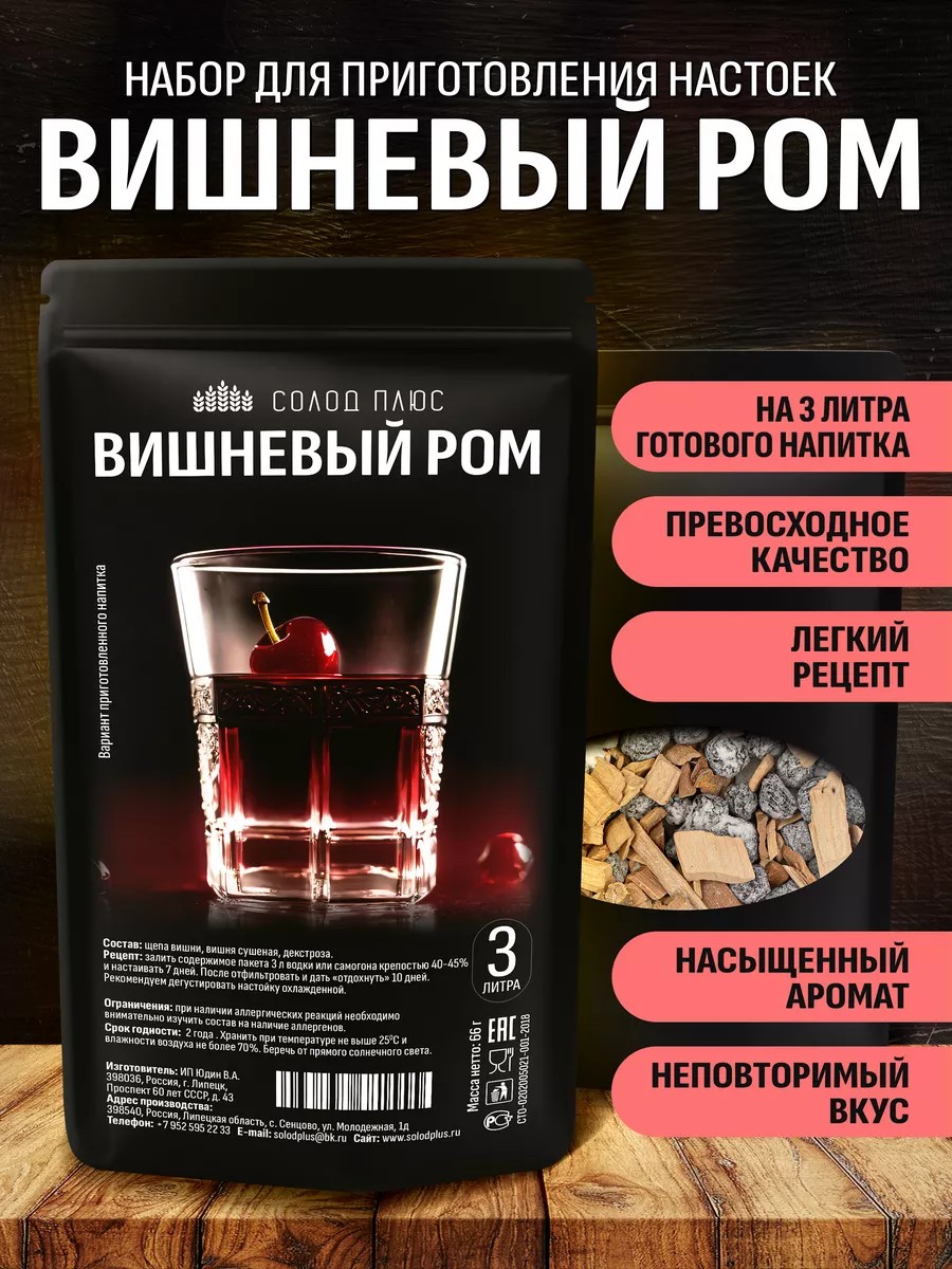 Настойка на самогоне Вишневый ром - Ароматный напиток с нотками вишни отчётливо будет ощущаться у вас во рту, а после длительного настаивания будет влиять на мягкость при её распитии. Ром длительной выдержки употребляется в чистом виде или со льдом. Подходит для кулинарии и изготовления коктейлей.Ром играет значительную роль в культуре большинства островов Вест-Индии и часто ассоциируется с британским королевским флотом и пиратством. Приготовление настоек на самогоне – это искусство, требующее тщательного подхода и особого набора инструментов. Наш продукт представляет собой полный комплект для создания крафтовых напитков из самогона в домашних условиях. Включает в себя вишневую щепу, сушёную вишню и декстрозу, которая придает напитку уникальный аромат и богатый вкус. С наборами Солод Плюс можно создавать свои уникальные рецепты, добавлять различные специи для получения необычных оттенков аромата и вкуса. Продукт подойдет как для зимнего времяпрепровождения, так и для летних вечеров на природе. Виноделы и любители экспериментов оценят возможности нашего продукта. Вишня для настойки очень хорошо подходит. В комплект входит все необходимое для создания вишневого рома прямо у себя дома. Вы можете использовать его как основу для приготовления фруктовых или травяных настоек на водке, добавлять ароматные специи и создавать свой уникальный алкоголь. Будь то старый проверенный рецепт или новые гастрономические открытия – ваш домашний мини-бар будет полон изысканных напитков!Состав: щепа вишни, вишня сушеная, декстроза. Рецепт: залить содержимое пакета 3 л водки или самогона крепостью 40-45% и настаивать 7 дней. После отфильтровать и дать «отдохнуть» 10 дней. Рекомендуем дегустировать настойку охлажденной.