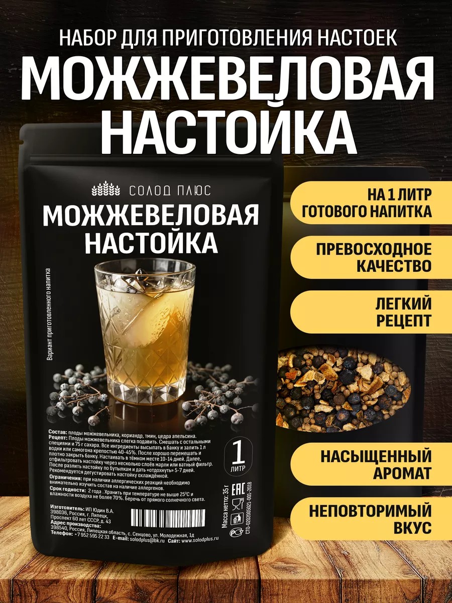 Можжевеловая настойка "Солод Плюс" со светло-прозрачным золотистым цветом, запоминается мягким, пряным, сбалансированным, легким ёлочным ароматом и слегка терпким вкусом, чуть более жестким, чем у джина. Отличное спиртное для мужской компании. Подходит к овощным и мясным закускам. Его можно использовать не только для поднятия настроения, но и в лечебных целях. Умеренное употребление оказывает на организм положительное воздействие, если он приготовлен с учетом всех нюансов. В напитке сохранится такое же количество полезных веществ, как и в самих ягодах.Наборы специй и трав Можжевеловая настойка — это отличный подарочный вариант для любителей самогона. В нашем наборе вы найдете все необходимое для приготовления напитка с неповторимым ароматом. В состав набора для приготовления спиртных настоек входят: можжевельника, тмина, ягоды, кориандр и других ценные растения. Благодаря этому каждый винокур сможет создать свою уникальную рецептуру самогона. Также в комплектации присутствует цедра апельсина. Наши продукты позволяют готовить как классическую версию самогона, так и эксклюзивные крафтовые напитки по типу джина или можжевеловой настойки. Для более сложного букета можно использовать несколько видов спирта одновременно или добавить фруктами: яблоками или грушами. Многие предпочитают использовать наши наборы специй и приправ для водки, что позволяет создать новый, уникальный вкус этого популярного напитка. Наш набор – это не просто подарок, это возможность для каждого самогонщика раскрыть свой талант и порадовать близких оригинальным продуктом. В зависимости от выбранной рецептуры напиток может быть приготовлен как для летнего сезона, так и зимой. Создание своего уникального напитка — это процесс захватывающий и интересный. Наш набор способствует его максимальному раскрытию! С помощью наших наборов специй и приправ, вы сможете создать уникальные вариации алкоголя. Добавьте свежие плоды для более яркого и фруктового вкуса вашего напитка.Состав: плоды можжевельника, кориандр, тмин, цедра апельсина.Рецепт: Плоды можжевельника слегка подавить. Смешать с остальными специями и 75 г сахара. Все ингредиенты высыпать в банку и залить 1 л водки или самогона крепостью 40-45%. После хорошо перемешать и плотно закрыть банку. Настаивать в тёмном месте 10-14 дней. Далее, отфильтровать настойку через несколько слоёв марли или ватный фильтр. После разлить настойку по бутылкам и дать «отдохнуть» 5-7 дней. Рекомендуется дегустировать настойку охлаждённой.