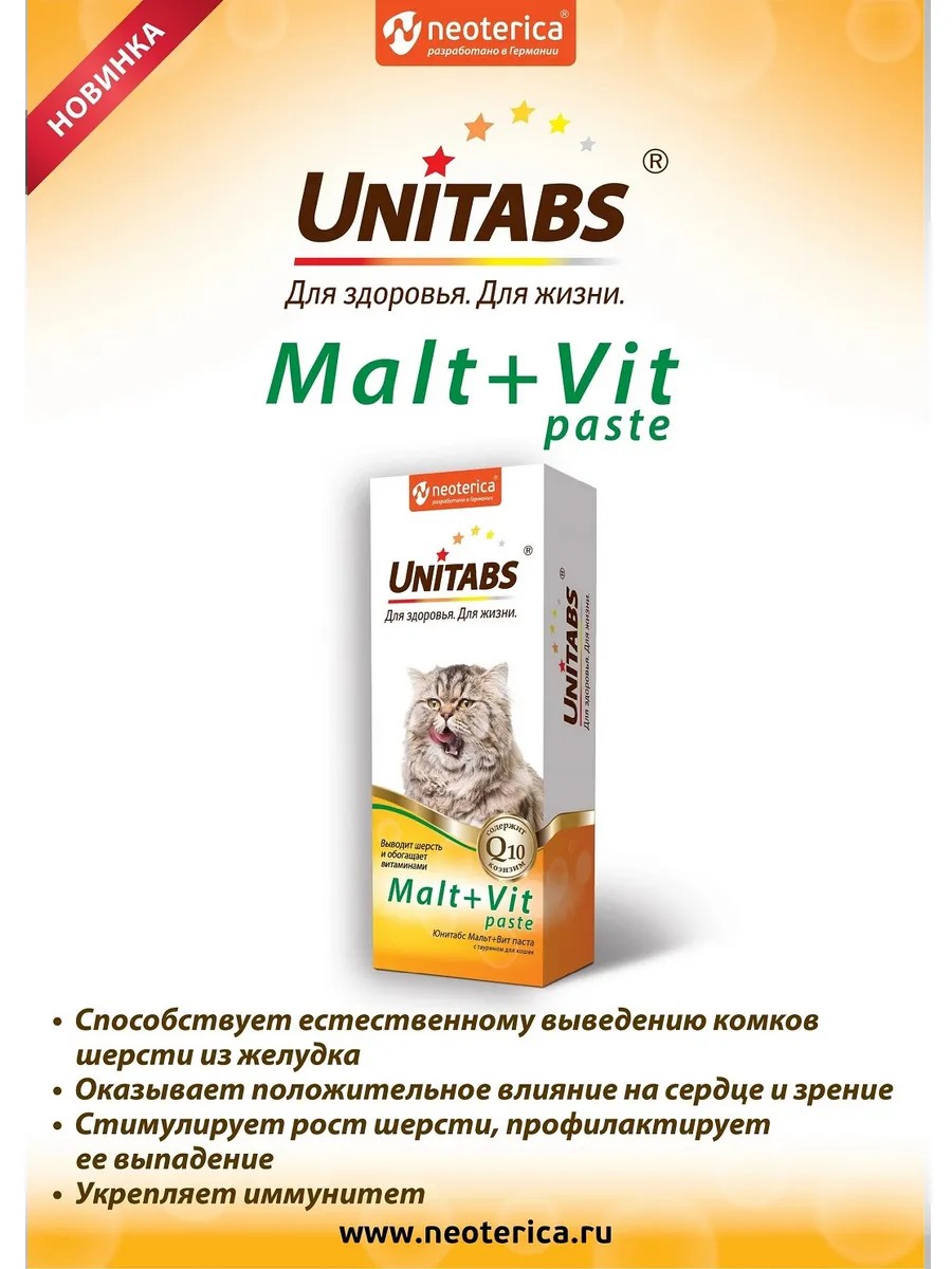 Unitabs Malt+Vit paste is used to remove hairballs in cats, as well as to maintain immunity, normalize metabolism and improve the condition of the skin and coat in cats.