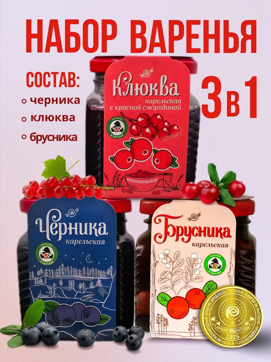 Mama Karelia jam is the winner of the "Best Product 2025" Gold Medal at ProdExpo 2025. Immerse yourself in a world of unique flavors with the "Three Jams" set, which includes three exquisite jams: lingonberry, blueberry, and cranberry with red currant. All berries are harvested in Karelia.