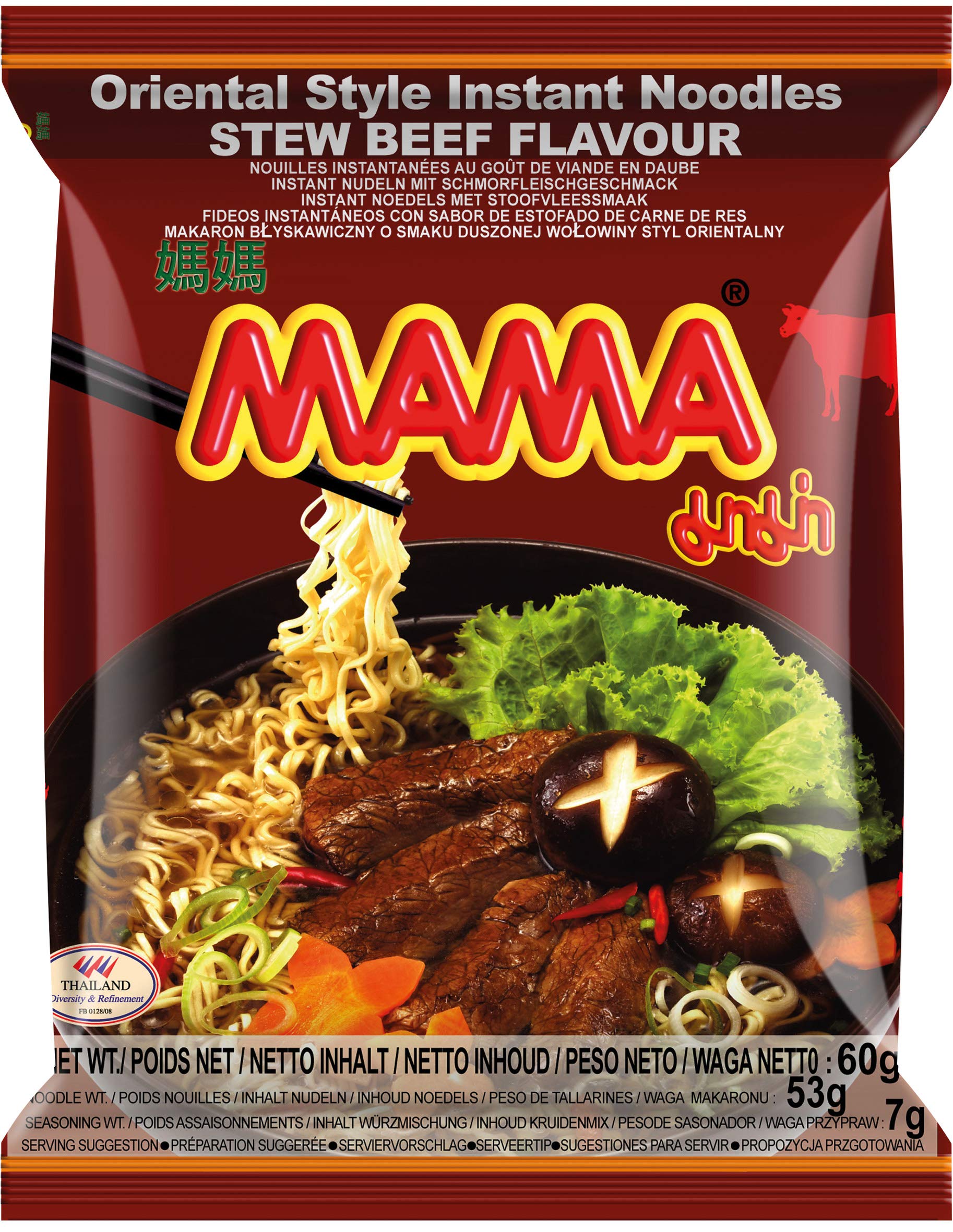 Mama Instant Noodles with Cooked Beef Flavor A delicious mid-meal option for home: MAMA instant noodles from the Thai brand are quick and easy to prepare. The combination of noodles in broth and the spicy, flavorful beef aroma provides an authentic Asian taste experience. Product Details: Mama Instant Noodles with Cooked Beef Flavor Quick and easy preparation. Please note: May contain traces of crustaceans, eggs, fish, milk, and sesame seeds. Preparation: Pour the contents of the bag into a saucepan with 350 ml of boiling water. Let the ingredients infuse for 3 minutes. Stir occasionally INGREDIENTS Ingredients: Wheat flour 78 , palm oil, salt, sugar, flavor enhancers (E621, E635, E640), spices, flavoring (SALTED), acidity regulators (E500, E501, E451), soy sauce powder (soybeans, salt, malt extract (barley), wheat, yeast extract, palm oil), thickener (E466), dried green onions, color (E150a), vegetable protein isolate (water, corn, soybeans), celery powder. May contain traces of eggs, milk, crustaceans, fish, sesame, and mollusks. (Carboxymethylcellulose, cellulose rubber) (E466). INSTRUCTIONS Pour the contents of the bag into a saucepan of 350 ml of boiling water. Let the ingredients infuse for 3 minutes. Stir occasionally. See moreMAMA Nouilles instantanées au goût du bœuf braisé - Soupe de nouilles instantanée de type oriental - Cuisine thaïlandaise authentique - 24 x 60 gDESCRIPTION DU PRODUIT DESCRIPTION DU PRODUIT Nouilles instantanées Mama au goût du bœuf cuit Un délicieux repas intermédiaire pour la maison : les nouilles instantanées de la marque thaïlandaise MAMA sont faciles et rapides préparer. La combinaison de pâtes dans le bouillon et l'arôme de bœuf épicé et épicé permet un goût oriental expérience. Détails du produit : Nouilles instantanées Mama au goût du bœuf cuit Préparation simple et rapide. Veuillez noter : peut contenir des traces de crustacés, d'œufs, de poisson, de lait et de graines de sésame Préparation : Versez le contenu du sac dans une casserole de 350 ml d'eau bouillante. Laissez infuser les ingrédients pendant 3 minutes. Mélanger occasionnellement INGRÉDIENTS Ingrédients : farine de blé 78 , huile de palme, sel, sucre, exhausteur de goût (E621, E635, E640), épices, arôme (SELLERIE), régulateurs d'acidité (E500, E501, E451), sauce soja en poudre (soja, sel, extrait de malt (orge), blé, extrait de levure. huile de palme), épaississant (E466), oignons verts séchés, colorant (E150a), protéines végétales isolées (eau, maïs, soja), poudre de céleri. Peut contenir des traces d'œufs, de lait, de crustacés, de poissons, de sésames et de mollusques. Carboxyméthylcellulose, caoutchouc cellulose) (E466). MODE D'EMPLOI Verser le contenu du sac dans une casserole de 350 ml d'eau bouillante. Laisser infuser les ingrédients pendant 3 minutes. Mélanger occasionnellement. Voir plus