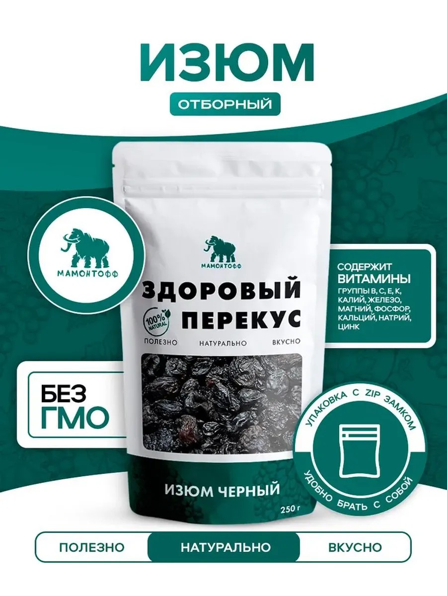 Покупая Мамонтофф, вы выбираете качество и высокий стандарт производства. Каждый кусочек изюма хранит в себе лучшее из природы. Добавьте немного черного изюма в свой рацион и откройте для себя все преимущества этого суперфуда.
