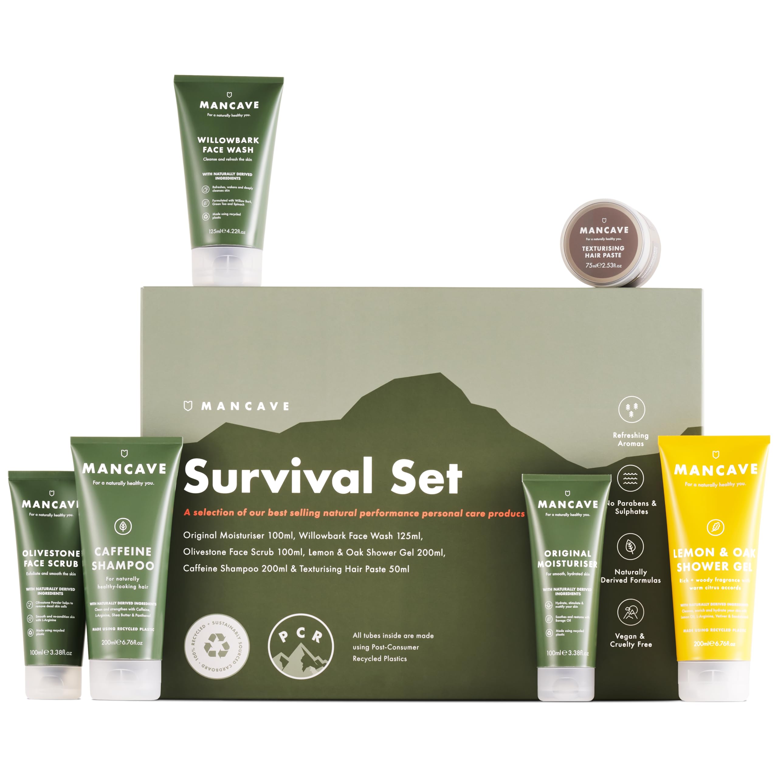 PLASTIC-FREE OUTER PACKAGING: None of the products in this set have been tested on animals and are all suitable for vegans, allowing you to enjoy a guilt-free grooming experience. All bottles are made from post-consumer recycled plastics, and the set's packaging is made from sustainably sourced cardboard and is easily recyclable. SKINCARE SET WITH TRAVEL-FRIENDLY PRODUCTS: The compact size of the products and the included box make this set ideal for travel. Whether you're going on a weekend getaway or a business trip, you can easily pack your essential grooming products, ensuring you always maintain impeccable style, wherever you are. A PRACTICAL AND STYLISH BATH AND SKINCARE SET: Packaged in an attractive, reusable box, the ManCave Survival Set for Men makes a stylish and practical gift for any occasion. Whether it's a birthday or a holiday, this set is sure to impress the men in your life who appreciate high-quality grooming products. PREMIUM PRODUCTS: Every item in this skincare set is carefully crafted from premium ingredients. From the revitalizing shampoo and moisturizing conditioner to the nourishing facial wash and soothing beard oil, each product is designed to deliver exceptional results and leave you feeling fresh and confident. COMPLETE MEN'S GROOMING AND CARE KIT: The ManCave Survival Set for men is the ultimate grooming kit for the modern man. It includes a range of high-quality products to cleanse and nourish your skin and care for and style your hair and beard, so you're always ready to look your best.PACKAGING EXTERNE SANS PLASTIQUE : aucun des produits de ce coffret n'a été testé sur les animaux et ils conviennent tous aux végétaliens, ce qui vous permet de profiter d'une expérience de soins de beauté sans culpabilité. Tous les flacons sont fabriqués à partir de plastiques recyclés post-consommation et l'emballage du coffret est fabriqué à partir de carton provenant de sources durables et est facilement recyclable. COFFRET DE SOIN AVEC DES PRODUITS FACILES À TRANSPORTER : la taille compacte des produits et la boîte incluse rendent cet ensemble idéal pour les voyages. Que vous partiez en week-end ou en voyage d'affaires, vous pouvez facilement emporter vos produits de toilette essentiels, ce qui vous permettra de toujours conserver un style impeccable, où que vous soyez. UN COFFRET DE BAIN ET DE SOINS PRATIQUE ET ÉLÉGANT : emballé dans une boîte attrayante et réutilisable, le coffret visage pour hommes Survival Set de ManCave constitue un cadeau élégant et pratique pour toutes les occasions. Qu'il s'agisse d'un anniversaire ou d'une fête, ce coffret ne manquera pas d'impressionner les hommes de votre entourage qui apprécient les produits de toilette de haute qualité. DES PRODUITS DE PREMIÈRE QUALITÉ : chaque article de ce coffret de soin pour la peau est fabriqué avec soin à partir d'ingrédients de première qualité. Du shampooing revitalisant à l'après-shampooing hydratant, en passant par le nettoyant nourrissant pour le visage et l'huile à barbe apaisante, chaque produit est conçu pour offrir des résultats exceptionnels et vous laisser une sensation de fraîcheur et de confiance. KIT COMPLET DE SOINS ET DE TOILETTE POUR HOMME : le coffret pour hommes Survival Set de ManCave est le kit de toilette ultime pour l'homme moderne. Il comprend une gamme de produits de haute qualité pour nettoyer et nourrir votre peau et prendre soin de vos cheveux et de votre barbe et les coiffer, afin que vous soyez toujours prêt à vous montrer sous votre meilleur jour.