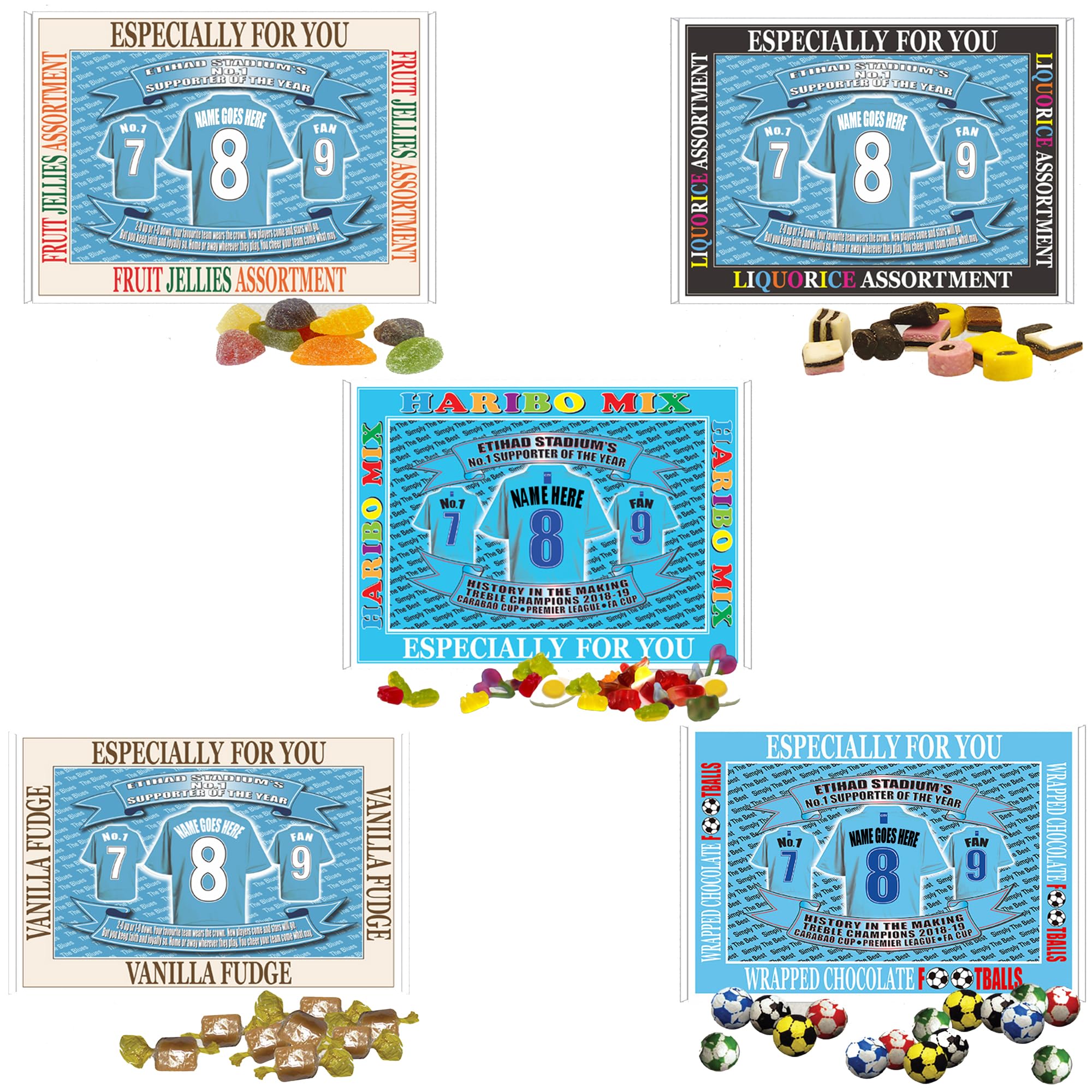 A perfect gift for any avid CITY FAN. Your favourite football team's shirt image printed onto a box lid containing 200g of your favourite sweets. To make this extra special, you can have a FREE Personalised name added to the box. Ingredients: LIQUORICE ASSORTMENT: Sugar, treacle, wheat flower , glucose syrup, desiccated coconut, vegetable oil, beef gelatine, cornflower, humectant, glycerol, natural colours, plain caramel, beetroot red, curcumin, anthocyanins, capsanthin, fat-reduced cocoa powder, liquorice powder, flavourings, glazing agent. Fruit and vegetable concentrates: Blackurrant, carrot and radish. This product contains wheat. VANILLA FUDGE Assortment Sugar, glucose syrup, full cream condensed milk (milk sugar), vegetable oils (palm kernel palm stearin oil), butter (milk), salt, emulsifier: soya lecithin flavourings. This product may contain egg and nut traces. FRUIT JELLIES ASSORTMENT: Sugar, glucose syrup, water, gelling agent, pectin acid: lactic acid flavourings. Colours: Anthocyanins. Chlorophylls, curcumin, capsanthin. This product may contain nuts, milk, sesame seeds and gluten. CHOCOLATE BALLS Ingredients: Sugar, vegetable oil (palm kernel), whey powder (milk), reduced fat cocoa powder, sorbitan tristearate, soya lecithin, natural bourbon vanilla. Allergens: Milk Soya. FRUIT GUMMIES MIX Sugar, Glucose syrup, dextrose, spirulina, starch, gelatine, acid, citric acid, palm fat, watergelatine, caramelised sugar syrup, flavouring fruit and plant concentrates apple, aronia, blackcurrant, elderberry, grape, kiwi, lemon, mango, nettle, orange, carrot, passion fruit, spinach glazing agents: beeswax carnauba wax, palm fat, water gelatine, colour: copper complexes to chlorophyll, invert sugar syrup elderberry extract, carob extract Any image or text displayed on this unofficial product has been independently produced and is in no way connected with, or endorsed by, the personalities, people, agents or organisations they may appear to depict. INGREDIENTS Liquorice Assortment Sugar, treacle, wheat flower , glucose syrup, desiccated coconut, vegetable oil, beef gelatine, cornflower, humectant, glycerol, natural colours, plain caramel, beetroot red, curcumin, anthocyanins, capsanthin, fat-reduced cocoa powder, liquorice powder, flavourings, glazing agent. Fruit and vegetable concentrates: Blackurrant, carrot and radish. This product contains wheat. Vanilla Fudge Assortment Sugar, glucose syrup, full cream condensed milk (milk sugar), vegetable oils (palm kernel palm stearin oil), butter (milk), salt, emulsifier: soya lecithin flavourings. This product may contain egg and nut traces. Fruit Jellies Assortment Sugar, glucose syrup, water, gelling agent, pectin acid: lactic acid flavourings. Colours: Anthocyanins. Chlorophylls, curcumin, capsanthin. This product may contain nuts, milk, sesame seeds and gluten.Manufactured in the UK. Supporting UK Small Businesses. Perfect Gift for Any Occasion. FREE Personalised Name - Up To 12 Characters.
