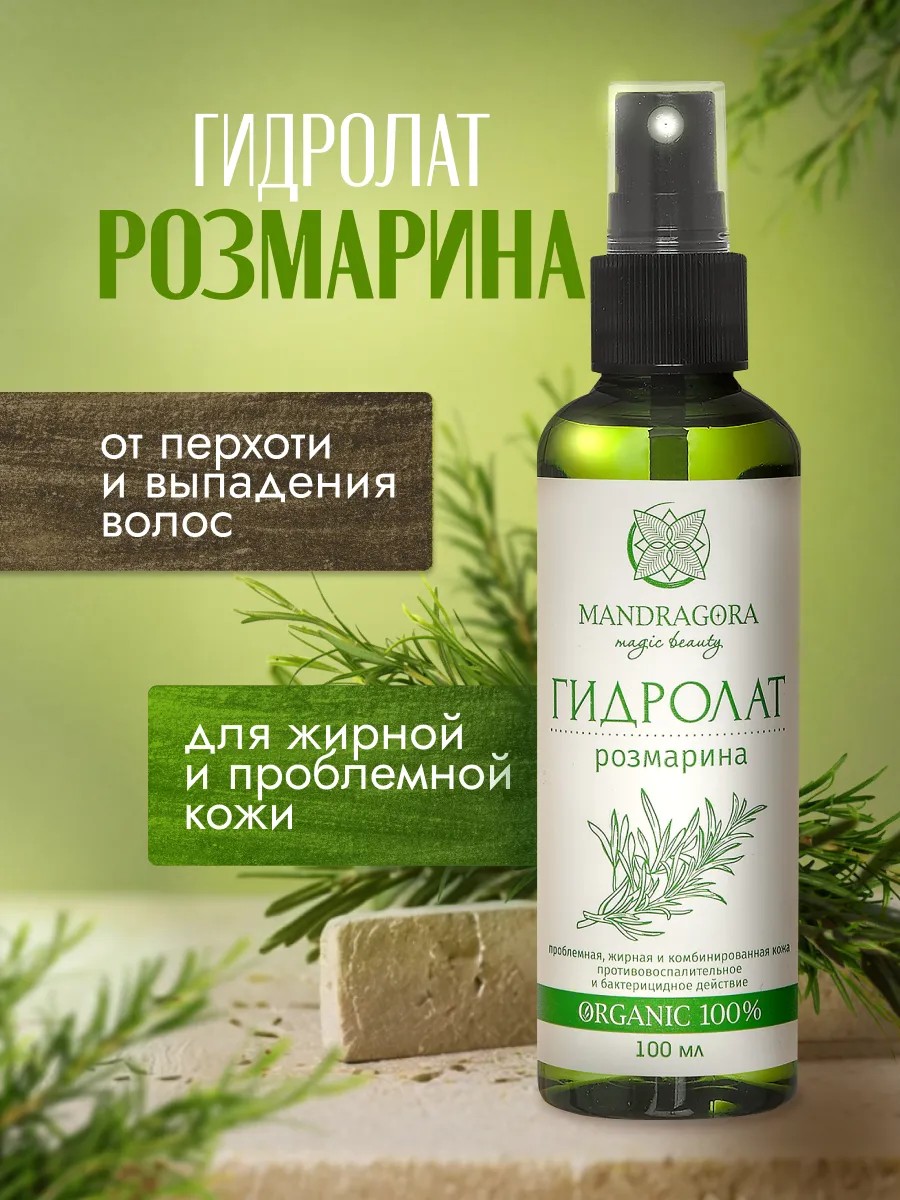 Гидролат розмарина — это натуральный тоник для жирной кожи лица и волос, которое идеально подходит и для проблемной кожи. Розмариновый тоник-спрей безопасен для подростковой кожи. Гидролат розмарина помогает бороться с прыщами, воспалениями и жирным блеском, а также обладает успокаивающими и регенерирующими свойствами.