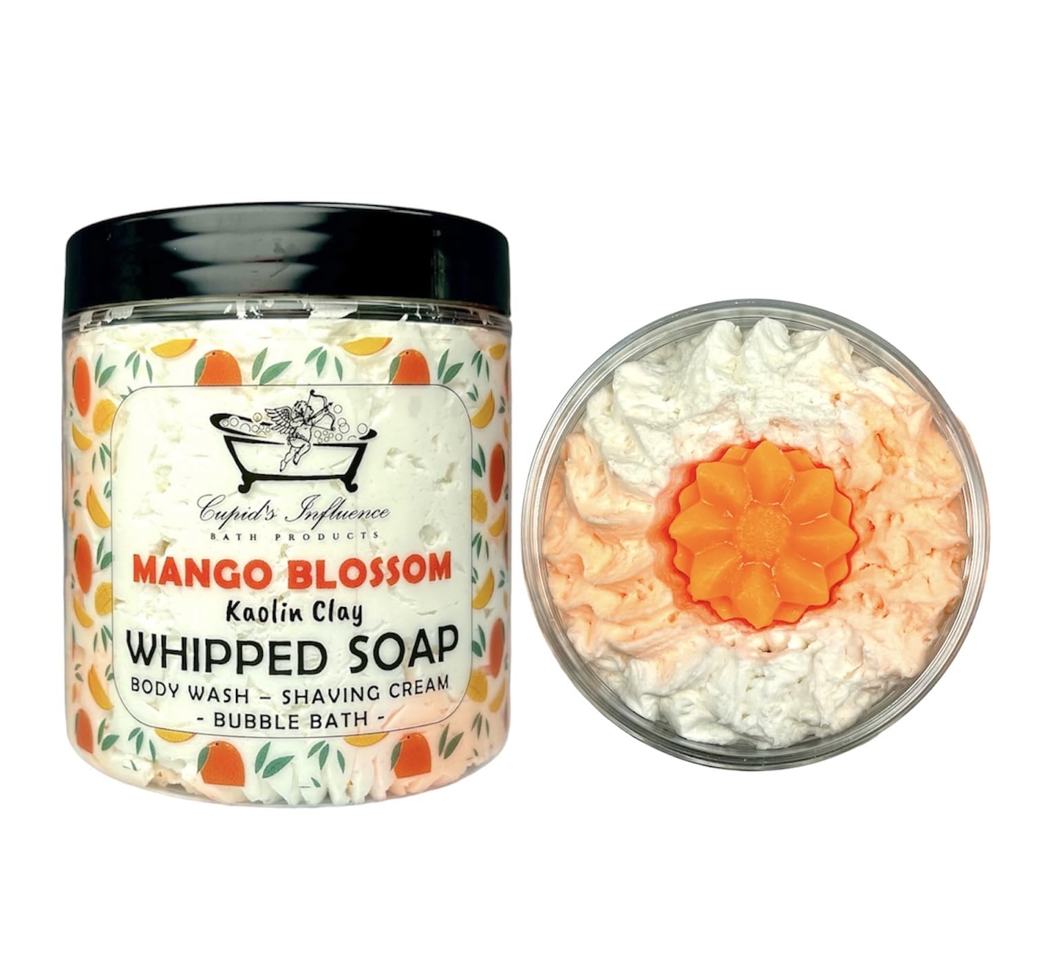 Wash Your Troubles Away with our Luxurious MANGO BLOSSOM multipurpose Whipped Soap. This semi-solid 3-in-1 cleanser serves as an all-over body wash, shaving foam, and solid bubble bath. It provides the perfect alternative to traditional shower gels, soaps, shampoos, and bubble bath soaks. Our whipped soap creates a rich foam and an abundance of bubbles, meaning a little goes a long way. It is infused with Apricot Kernel Oil and Kaolin Clay, leaving your skin purified and incredibly silky. Fragranced with delightful aroma of tropical mango and an array of exotic fruits. Our range of whipped soaps are proudly Vegan & Cruelty-Free. Net Weight: 250ml jar with a minimum of 180gr "e" of product. INGREDIENTS Aqua, Glycerine, Sorbitol, Sodium Cocoyl Isethionate, Disodium Lauryl Sulfosuccinate, Sodium Chloride, Kaolin, Parfum, Prunus Armeniaca Kernel Oil, Polysorbate 80, Phenoxyethanol, Tetrasodium EDTA, Polyurethane-11, CI19140, Amyl Cinnamic Aldehyde, Benzyl Alcohol, Benzyl Salicylate, Coumarin, Limonene, Linalool. DIRECTIONS After wetting your skin, scoop a portion of whipped soap from the jar, lather & apply it to the desired areas of your body. Rinse thoroughly & follow up with body butter, oil or lotion. For best results, use a mesh body puff sponge with this product. SAFETY WARNING FOR EXTERNAL USE ONLY. AVOID CONTACT WITH EYES. DO NOT USE ON DAMAGED SKIN. IF IRRITATION OCCURS, DISCONTINUE USE. KEEP OUT OF REACH OF CHILDREN. NOT TO BE USED BY INFANTS UNDER 3 YEARS. See moreVegan & Cruelty-Free. Produces a luxurious lather & abundant bubbles - little amount goes a long way. Perfect alternative to traditional shower gels, soaps, shaving foams or shampoos. Formulated with natural Kaolin Clay - effectively purifies & leaves the skin feeling exceptionally silky. Enriched with Apricot Kernel Oil - aids in maintaining radiance & softness of skin. Immerse your senses in the delightful aroma of tropical mango and an array of exotic fruit notes.