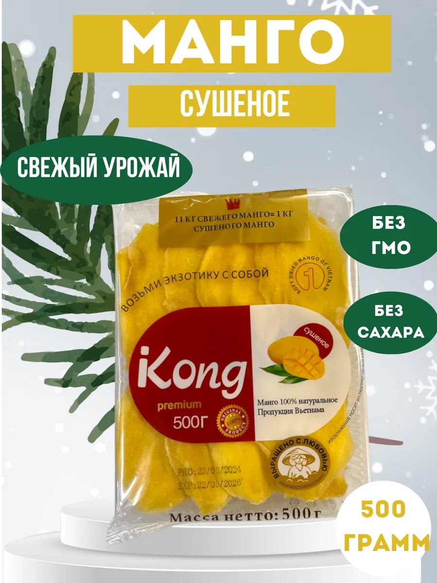 Манго сушеное без сахара Kong – это идеальный выбор для тех, кто ценит натуральные и полезные продукты. Этот продукт выращен без использования генетически модифицированных организмов (ГМО), ароматизаторов и добавленного сахара, что делает его особенно привлекательным для здорового питания. Сушеный манго сохраняет все свои питательные свойства, включая высокое содержание углеводов (76 г/100 г) и умеренное количество белка (2.45 г/100 г), обеспечивая энергетическую ценность в 320 ккал на 100 грамм. Этот продукт является отличным источником энергии и питательных веществ, подходящим для активных людей и тех, кто следит за своим здоровьем.