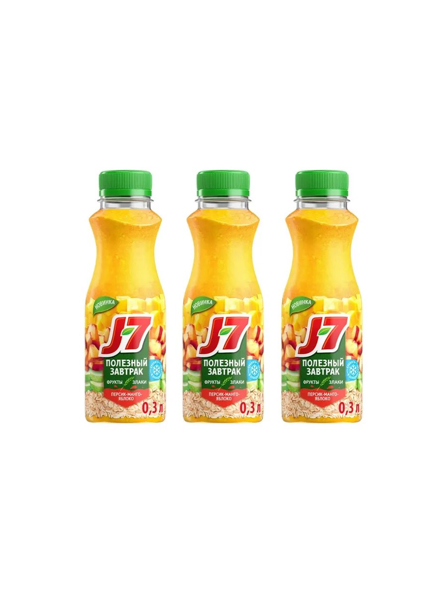 Продукт питьевой J7 «Полезный завтрак» Манго-Персик-Яблоко со злаками (упаковка 3 шт по 300 мл) из России — это стерилизованный фруктово-злаковый напиток, изготовленный из концентрированных фруктовых пюре и сока яблока, персика и манго с добавлением овсяных хлопьев.