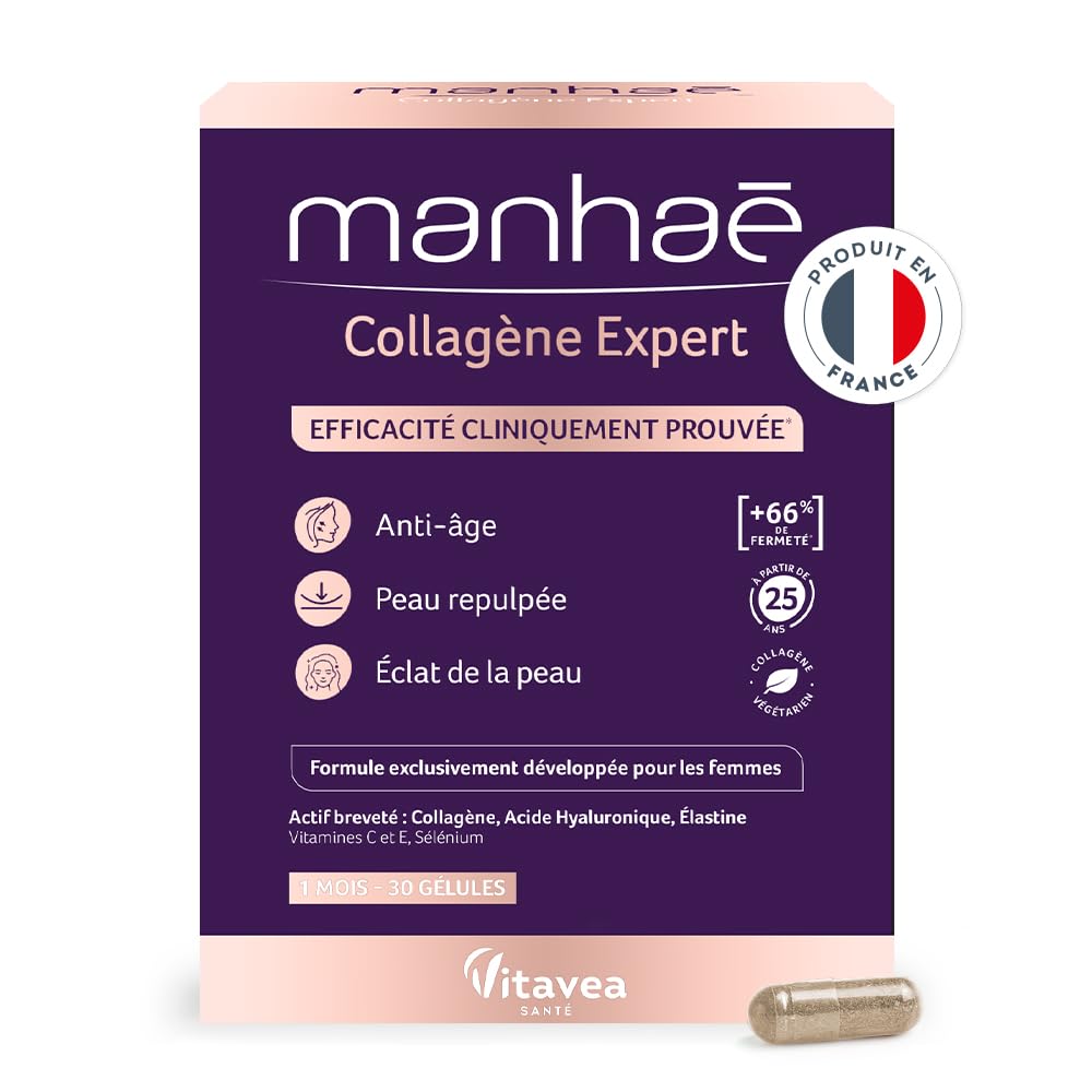 INGREDIENTS Shelled EGG membrane plant-based capsule (cellulose derivative) vitamins C and E selenium yeast (Saccharomyces cerevisiae) anti-caking agent: magnesium salts of fatty acids. DIRECTIONS FOR USE 1 capsule per day to be swallowed during the main meal. SAFETY WARNING Do not exceed the recommended daily dose. To be consumed as part of a varied and balanced diet and a healthy lifestyle. Keep out of reach of young children. MADE IN FRANCE: The Manhaé Collagen Expert food supplement based on collagen, hyaluronic acid, elastin, vitamin C, vitamin E and selenium, is made in France in our laboratories in Vendée, in compliance with manufacturing and quality processes. ONE DAY TAKE: Thanks to its concentration of active ingredients, just one capsule per day of our Manhaé Collagen Expert is enough to provide you with all the benefits. Our Manhaé Collagen Expert contains 30 capsules for a 30-day course. Developed by micronutrition experts, this food supplement based on collagen and hyaluronic acid is gluten-free, lactose-free, sugar-free, gelatin-free. It is also formulated without artificial flavors or colors. ? PROVEN EFFECTIVENESS: 20 clinical studies carried out on the new generation patented active ingredient have proven its effectiveness. They show a clear improvement in the skin: skin firmness 66 , facial hydration 43 , skin elasticity 25 . Thanks to an exclusive formula enriched with vitamins C and E and selenium, Manhaé Collagène Expert is your ally for firm and plumped skin. 2018 clinical study vs placebo, 300 mg per day, 16 people, between 45 and 75 years old, 60 days. COLLAGEN AND HYALURONIC ACID: From the age of 25, collagen production deteriorates. This loss is accentuated by UV rays, tobacco, pollution. The skin loses its elasticity and radiance. Manhaé Collagène Expert is a vegetarian collagen in an innovative matrix composed of collagen, hyaluronic acid and elastin, the 3 key components of the skin. More than just collagen, it is a patented active ingredient with a natural complex of bioactive molecules that act in synergy. ANTI-AGING AND ANTI-WRINKLE: Manhaé Collagène Expert is the complete solution to help women maintain sublimated and plumped skin. Its innovative matrix contains active ingredients recognized for their anti-aging action: collagen, hyaluronic acid, elastin, vitamin C, vitamin E and selenium. Specially formulated for women, Manhaé Collagène Expert helps fight skin aging, contributes to an anti-wrinkle action and firmness. of the skin. INGRÉDIENTS Membrane d'ŒUF coquillère gélule d'origine végétale (dérivé de cellulose) vitamines C et E levure séléniée (Saccharomyces cerevisiae) anti-agglomérant : sels de magnésium d'acides gras. MODE D'EMPLOI 1 gélule par jour à avaler au cours du repas principal. AVERTISSEMENT DE SÛRETÉ Ne pas dépasser la dose journalière recommandée. À consommer dans le cadre d'une alimentation variée et équilibrée et d'un mode de vie sain. Tenir hors de portée des jeunes enfants. FABRICATION FRANÇAISE : Le complément alimentaire Manhaé Collagène Expert à base de collagène, acide hyaluronique, élastine, vitamine C, vitamine E et sélénium, est fabriqué en France dans nos laboratoires en Vendée, dans le respect des processus de fabrication et de qualité. UNE SEULE PRISE PAR JOUR : Grâce à sa concentration en actifs, une seule gélule par jour de notre Manhaé Collagène Expert suffit à vous en apporter tous les bénéfices. Notre Collagène Expert Manhaé contient 30 gélules pour une cure de 30 jours. Développé par des experts en micronutrition, ce complément alimentaire à base de collagene et acide hyaluronique est sans gluten, sans lactose, sans sucre, sans gélatine. Il est également formulé sans arôme ni colorant artificiel. ? EFFICACITÉ PROUVEÉ : 20 études cliniques réalisées sur l'actif breveté nouvelle génération ont prouvé son efficacité. Ils montrent une nette amélioration de la peau : fermeté de la peau 66 , hydratation du visage 43 , élasticité de la peau 25 . Grâce à une formule exclusive enrichie en vitamines C et E et sélenium, Manhaé Collagène Expert est votre allié pour une peau ferme et repulpée. étude clinique 2018 vs placebo, 300 mg par jour, 16 personnes, entre 45 et 75 ans, 60 jours. COLLAGENE ET ACIDE HYALURONIQUE : Dès 25 ans, la production de collagène se détèriore. Cette perte est accentuée par les rayons UV, le tabac, la pollution… La peau perd de son élasticité et de son éclat. Manhaé Collagène Expert, c'est un collagène végétarien dans une matrice innovante composée de collagène, acide hyaluronique et élastine, les 3 composants clés de la peau. Plus qu'un collagène, c'est un actif breveté avec un complexe naturel de molécule bioactives qui agissent en synergie. ANTI-ÂGE ET ANTI-RIDES : Manhaé Collagène Expert est la solution complète pour accompagner les femmes à maintenir une peau sublimée et repulpée. Sa matrice innovante contient des actifs reconnus pour leur action anti-âge : collagène, acide hyaluronique, élastine, vitamine C, vitamine E et sélénium. Spécialement formulé pour les femmes, Manhaé Collagène Expert aide à lutter contre le vieillissement de la peau, contribue à une action anti-rides et à la fermeté. de la peau.