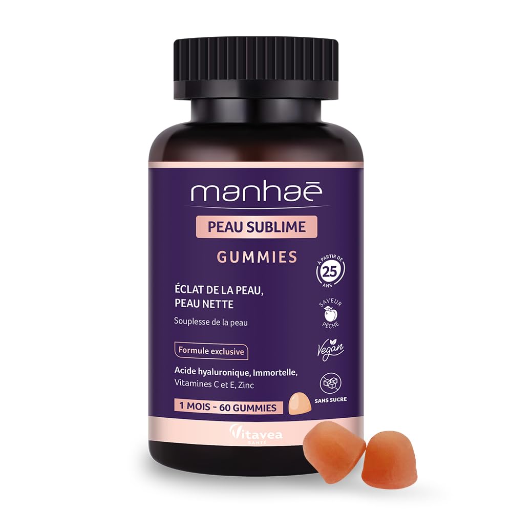 : Food supplement based on hyaluronic acid, Italian immortelle extract, vitamins C and E and zinc with sweeteners. Product details: Its exclusive nutritional formula is based on a unique combination: • Hyaluronic acid improves the radiance of the skin. It helps keep the skin firm and prevent the first signs of aging • Immortelle, a flower that never fades, has been recognized and used for its multiple virtues on the body and face since ancient Greece • Zinc contributes to the maintenance of normal skin • Vitamin C helps protect cells against oxidative stress and contributes to the normal formation of collagen to ensure the normal function of the skin • Vitamin E helps protect cells from oxidative stress. About Vitavea Vitavea, specialist in natural well-being, offers you a wide range of products to take care of you. We are committed to supporting you in your well-being process and enabling you to find the product that meets your needs. Accessible to all, easy to use, our products fit ideally into your daily life. All our products are made in France, guaranteeing you quality and respect for manufacturing processes. With Vitavea, well-being and health are within reach! For 2 gummies: Hyaluronic acid 50 mg Italian immortelle extract 15 mg Vitamin C 25 mg (31 NRV ) Vitamin E 3 mg (25 NRV ) Zinc 1.5 mg (15 NRV ) NRV Nutritional Reference Values Ingredients: Sweeteners: maltitol syrup, sorbitol syrup gelling agent: pectin sweetener: sorbitol sodium hyaluronate vitamin C acidifier: citric acid maltodextrin vitamin E extract of Italian immortelle (Helichrysum italicum) natural flavor coconut oil (Cocos nucifera) anti-caking agent: carnauba wax acidity corrector: sodium citrate mineral: zinc citrate coloring: anthocyanins. Directions for use 2 gummies per day, to chew. Precautions for use Consume within 6 months after opening. Do not exceed the recommended daily dose. To be consumed as part of a varied, balanced diet and a healthy lifestyle. Keep out of reach of children. Store in a cool, dry place (recommended under 25ºC). Avoid direct sunlight. Excessive consumption may have laxative effects Ingredients Sweeteners: maltitol syrup, sorbitol syrup gelling agent: pectin sweetener: sorbitol sodium hyaluronate vitamin C acidifier: citric acid maltodextrin vitamin E extract of Italian immortelle (Helichrysum italicum) natural flavor coconut oil (Cocos nucifera) anti-caking agent: carnauba wax acidity corrector: sodium citrate mineral: zinc citrate coloring: anthocyanins. INGREDIENTS Sweeteners: maltitol syrup, sorbitol syrup gelling agent: pectin sweetener: sorbitol sodium hyaluronate vitamin C acidifier: citric acid maltodextrin vitamin E extract of Italian immortelle (Helichrysum italicum) natural flavor coconut oil (Cocos nucifera) anti-caking agent: carnauba wax acidity corrector: sodium citrate mineral: zinc citrate coloring: anthocyanins.100 FRENCH FORMULA: Our Manhaé Peau Sublime Gummies food supplement is developed in France in compliance with manufacturing and quality processes. DIRECTIONS FOR USE: Manhaé Peau Sublime Gummies is a food supplement based on hyaluronic acid, Italian Immortelle, Vitamin C, Vitamin E and Zinc to be taken twice a day. GOURMET AND EFFECTIVE FORMULA: Our peach-flavored gummies are vegan and without added sugar and made from natural ingredients known for their effectiveness for sublime, plumped and luminous skin. UNIQUE ACTIVE INGREDIENTS: The formula is composed of a synergy of active ingredients that will beautify the skin. Hyaluronic acid improves the condition of the skin. Immortelle, a flower symbolizing sustainability, recognized since ancient Greece for its multiple benefits for the body and face. Zinc, contributing to the maintenance of normal skin. Vitamin C and vitamin E fight oxidative stress and protect cells. BEAUTIFUL SKIN: Manhaé Peau Sublime Gummies is the ideal solution for beautiful skin. With its unique formula developed primarily for women's needs, Manhaé Peau Sublime Gummies is composed of hyaluronic acid, Italian Immortelle, Vitamin C, Vitamin E and Zinc. : Complément alimentaire à base d'acide hyaluronique, d'extrait d'immortelle d'Italie, de vitamines C et E et de zinc avec édulcorants. Détail du produit : Sa formule nutritionnelle exclusive repose sur une association unique : • L'acide hyaluronique améliore l'éclat de la peau. Il aide à maintenir la peau ferme et à prévenir les premiers signes de l'âge • L'immortelle, fleur qui ne se fane jamais, est reconnue et utilisée pour ses multiples vertus sur le corps et le visage depuis la Grèce antique • Le zinc contribue au maintien d'une peau normale • La vitamine C contribue à protéger les cellules contre le stress oxydatif et contribue à la formation normale de collagène pour assurer la fonction normale de la peau • La vitamine E contribue à protéger les cellules du stress oxydatif. A propos de Vitavea Vitavea, spécialiste du bien-être au naturel, vous propose une large gamme de produits pour prendre soin de vous. Nous avons à cœur de vous accompagner dans votre démarche bien-être et de vous permettre de trouver le produit qui répond à vos besoins. Accessibles à tous, faciles d'utilisation, nos produits s'intègrent idéalement dans votre vie quotidienne. Tous nos produits sont fabriqués en France, vous garantissant qualité et respect des processus de fabrication. Avec Vitavea, le bien-être et la santé sont à portée de main ! Pour 2 gummies : Acide hyaluronique 50 mg Extrait d'immortelle d'Italie 15 mg Vitamine C 25 mg (31 VNR ) Vitamine E 3 mg (25 VNR ) Zinc 1,5 mg (15 VNR ) VNR Valeurs Nutritionnelles de Référence Ingrédients : Édulcorants : sirop de maltitol, sirop de sorbitol gélifiant : pectine édulcorant : sorbitol hyaluronate de sodium vitamine C acidifiant : acide citrique maltodextrine vitamine E extrait d'immortelle d'Italie (Helichrysum italicum) arôme naturel huile de coco (Cocos nucifera) anti-agglomérant : cire de ca