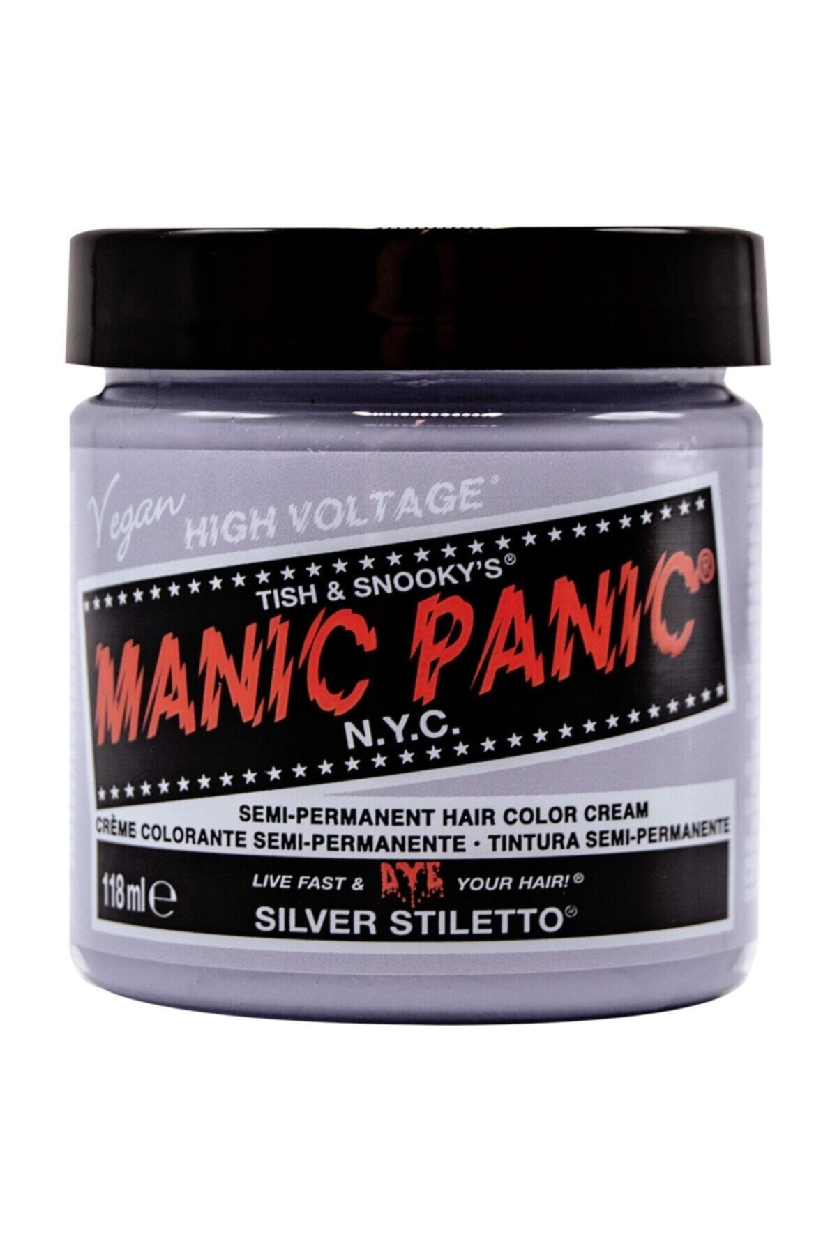 Our 41st anniversary special silver gray colorSilver Stilettois now available in our "Classic" formula. OurSilver Stilettocolor, which emerged as a result of the intense interest in Virgin Snow and the voting of Manic Panic followers from all around the world, gives a silver gray color on hair lightened up to platinum and can also be used in the pastelization process by mixing with other colors.