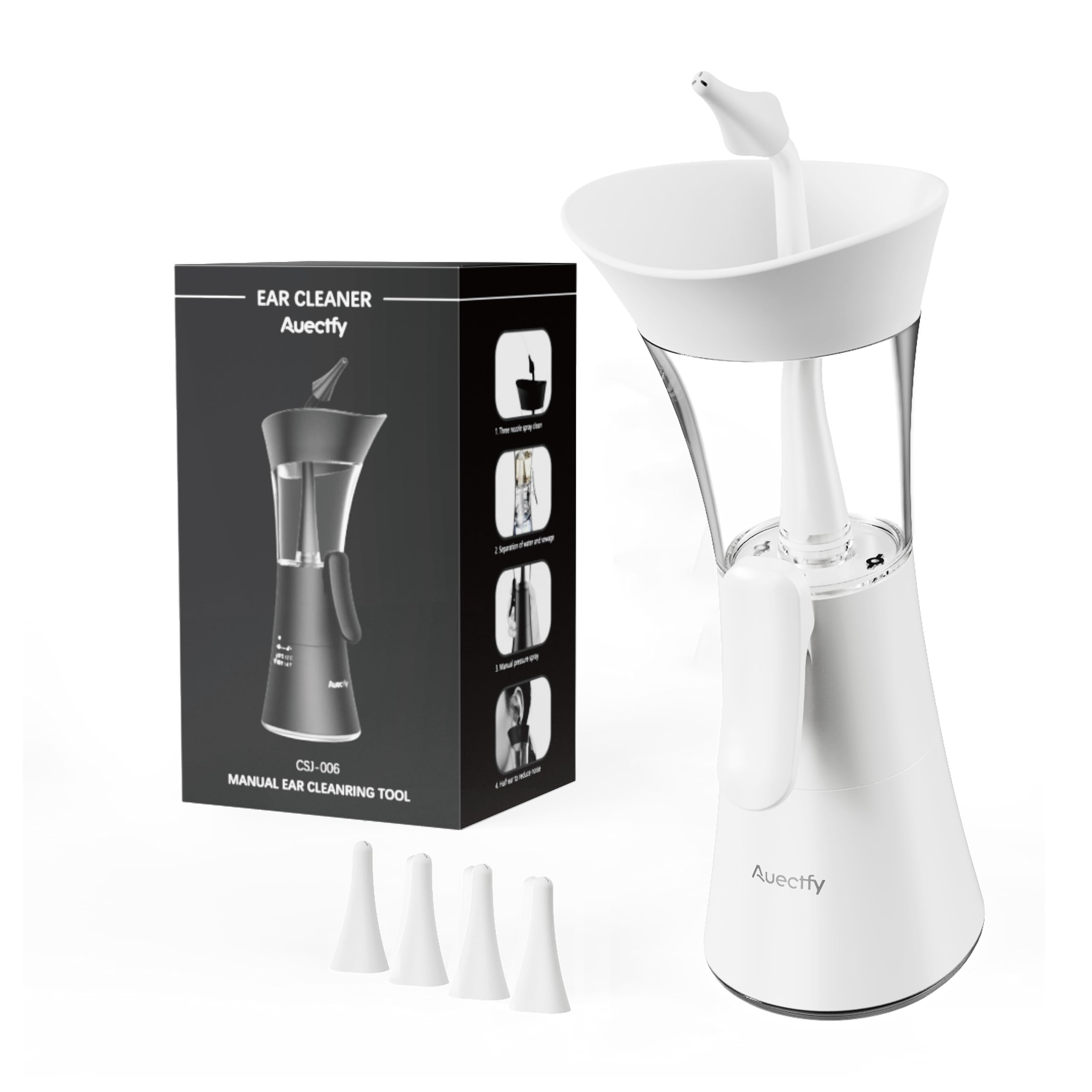 PACKAGE INCLUDES :Our product includes 1 ear cleaner kit, 4 replacement nozzles, 1 instruction manual.recommended you follow the steps in instruction manual when using it for the first time. EASY TO USE AND CLEAN : Our manual ear cleaner is easy to clean and reuse which you control the speed of the stream and frequency yourself. it activated by the button on the side. The harder you pump, the harder it sprays so you are in control of the pressure.ps:recommend using ear wax removal drops prior to use to loosen wax. using it after a shower, so the ear wax is softer (if you don't use drops). SAFE AND EFFECTIVE : Our ear cleaning kit can gently clean your ears, remove earwax, dirt and debris without damaging your skinSimply fill the unit with water and there is a small button that acts as a pump to pump the water into your ears. The device not only sprays the water into your ear, but also catches any water that comes out and it's quite a nifty design. it doesn't need any power and instead I manual control, this gives you an easy way to control the amount of pressure you want to apply . HIGH QUALITY :It is well made from high quality materials silicone tip is durable,The soft silicone tip is very gentle on the ears.We upgraded water outlet button it stronger and save effort.Earwax remover has the performance of fully machine washable, allowing easy use even while showering. NEW UPGRADED DESIGN :Auectfy ear wax removal tool kit is an innovative product specifically designed for optimal ear canal health, it uses a hand pump and single-hand operation. Ergonomic design fits comfortably in all hand sizes.