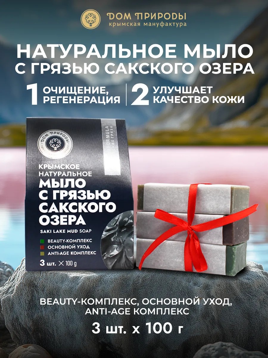 | Комплектация | Крымское натуральное мыло с грязью Сакского озера "Beauty-комплекс" - 1 шт.; Крымское натуральное мыло с грязью Сакского озера "Основной уход" - 1 шт.; Крымское натуральное мыло с грязью Сакского озера "Anti-age комплекс" - 1 шт. |