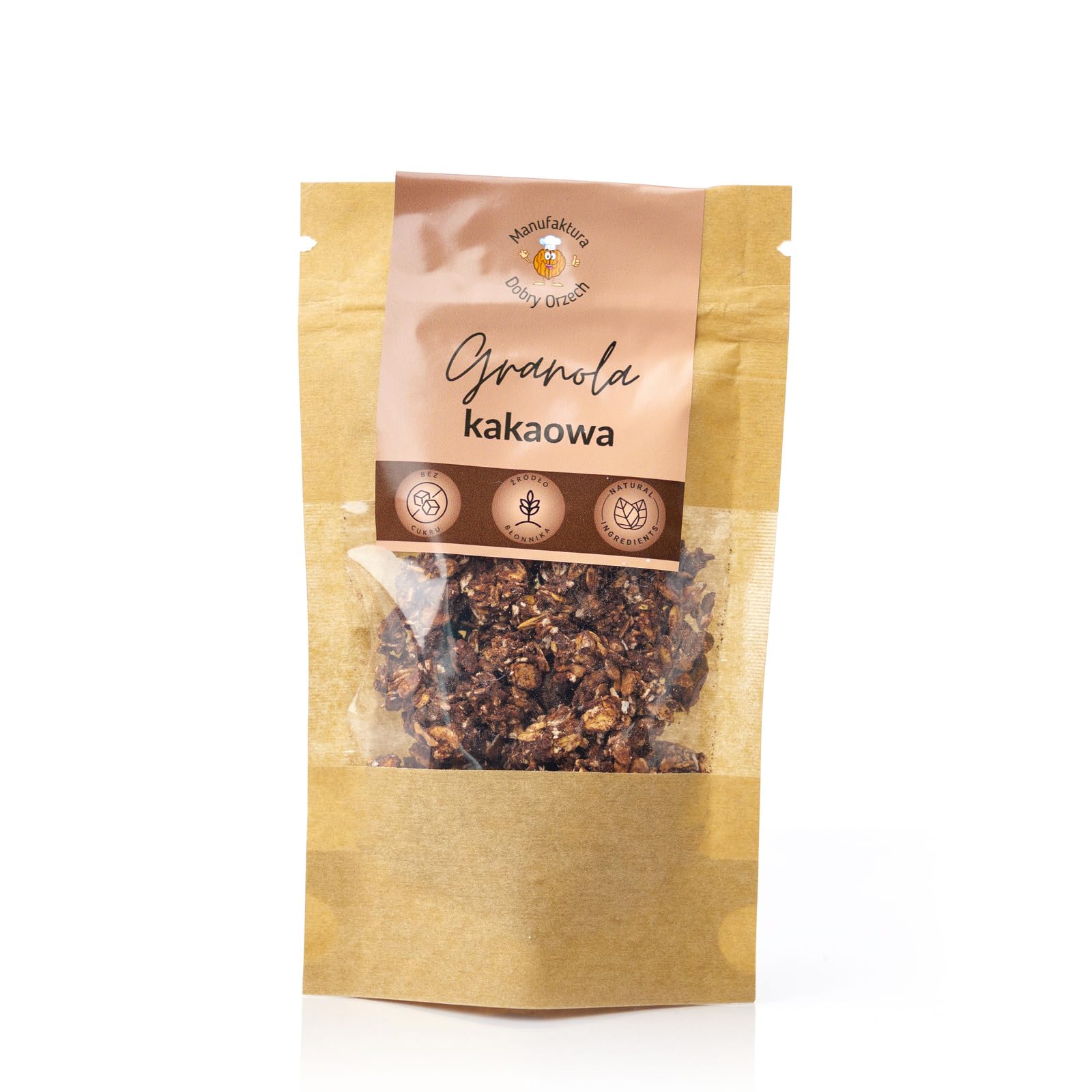 Natural Cocoa Granola from Manufaktura Dobry Orzech is a combination of crunchy oat flakes, roasted nuts, dried fruit, and a delicate touch of cocoa, created for those who love a nutritious and delicious breakfast. This unique blend of ingredients not only gives the granola a great taste but also provides valuable nutrients. The oat flour, which forms the base of this natural granola, provides fiber and energy for the whole day. The nuts add crunch and provide healthy fats, while the dried fruit adds a touch of sweetness and provides natural vitamins and minerals. All of this is complemented by a hint of cocoa, which gives the granola a unique flavor. Natural Cocoa Granola is not only a tasty addition to yogurt, milk, or plant-based drinks but also a perfect snack on the go. With no added artificial colors or preservatives, it's an ideal choice for those who care about their health. Dive into the intense flavor of cocoa granola and start your day with a healthy and nutritious breakfast! Brand: Good Nuts. Ingredients: Oat flakes, multifloral honey, dried cranberries (cranberries, sunflower oil, apple juice), flax seeds, sunflower seeds, cocoa 5 , peanuts, pumpkin seeds. Nutritional Information: Energy per 100g: 1491 kJ 357 kcal Fat 11.2g (of which saturates 1.4g) Carbohydrate 58.3g (of which sugars 21.4g) Fiber 6.6g Protein 9.6g Salt 0.1gGranola au Cacao Naturel (250g)DESCRIPTION DU PRODUIT Natural Cocoa Granola de Manufaktura Dobry Orzech est une combinaison de flocons d'avoine croquants, de noix grillées, de fruits secs et d'une délicate touche de cacao, créée pour les amateurs d'un petit-déjeuner nutritif et savoureux. Ce mélange unique d'ingrédients donne non seulement un bon goût au granola, mais fournit également des nutriments précieux. La farine d'avoine, qui constitue la base de ce granola naturel, apporte des fibres et de l'énergie pour toute la journée. Les noix ajoutent du croquant et fournissent des graisses saines, tandis que les fruits secs ajoutent une note sucrée et fournissent des vitamines et des minéraux naturels. Le tout est complété par une pointe de cacao, qui donne au granola un goût unique. Le Natural Cocoa Granola n'est pas seulement un complément savoureux au yaourt, au lait ou aux boissons à base de plantes, mais aussi une collation parfaite pour la route. Sans ajout de colorants artificiels ni de conservateurs, c'est un choix idéal pour ceux qui se soucient de leur santé. Plongez dans la saveur intense du granola au cacao et commencez votre journée avec un petit-déjeuner sain et nutritif ! Marque Bonne noix Composition Composition Flocons d'avoine, miel multifloral, canneberges séchées (canneberges, huile de tournesol, jus de pomme), graines de lin, graines de tournesol, cacao 5 , cacahuètes, graines de citrouille Valeurs nutritionnelles Valeur énergétique en 100g 1491 kJ 357 kcal Graisse 11,2g y compris les graisses saturées 1,4g Les glucides 58,3g y compris les sucres 21,4g Fibre 6,6g Protéine 9,6g Sel 0,1g