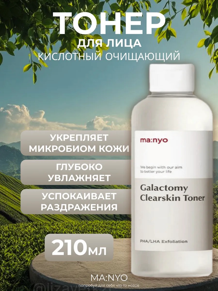 Кислотный очищающий тонер Manyo Galactomy Clearskin Toner отшелушивает, ускоряет процессы регенерации и восстановления, избавляет от шелушения, выравнивает тон. Помогает очистить поры и деликатно полирует рельеф без раздражения. Содержит PHA и LHA, галактомисис, пантенол, экстракты риса, коры ивы, розмарина.