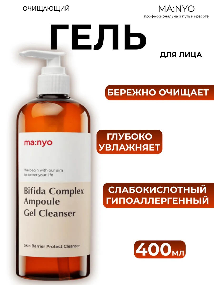 Очищающий гель с лизатом бифидобактерий Manyo Bifida Complex Ampoule Gel Cleanser деликатно удаляет загрязнения и растворяет комедоны, не провоцирует сухости и стянутости после умывания. Содержит пробиотики, 7 видов гиалуроновой кислоты, PHA, папаин и Aquaxyl.