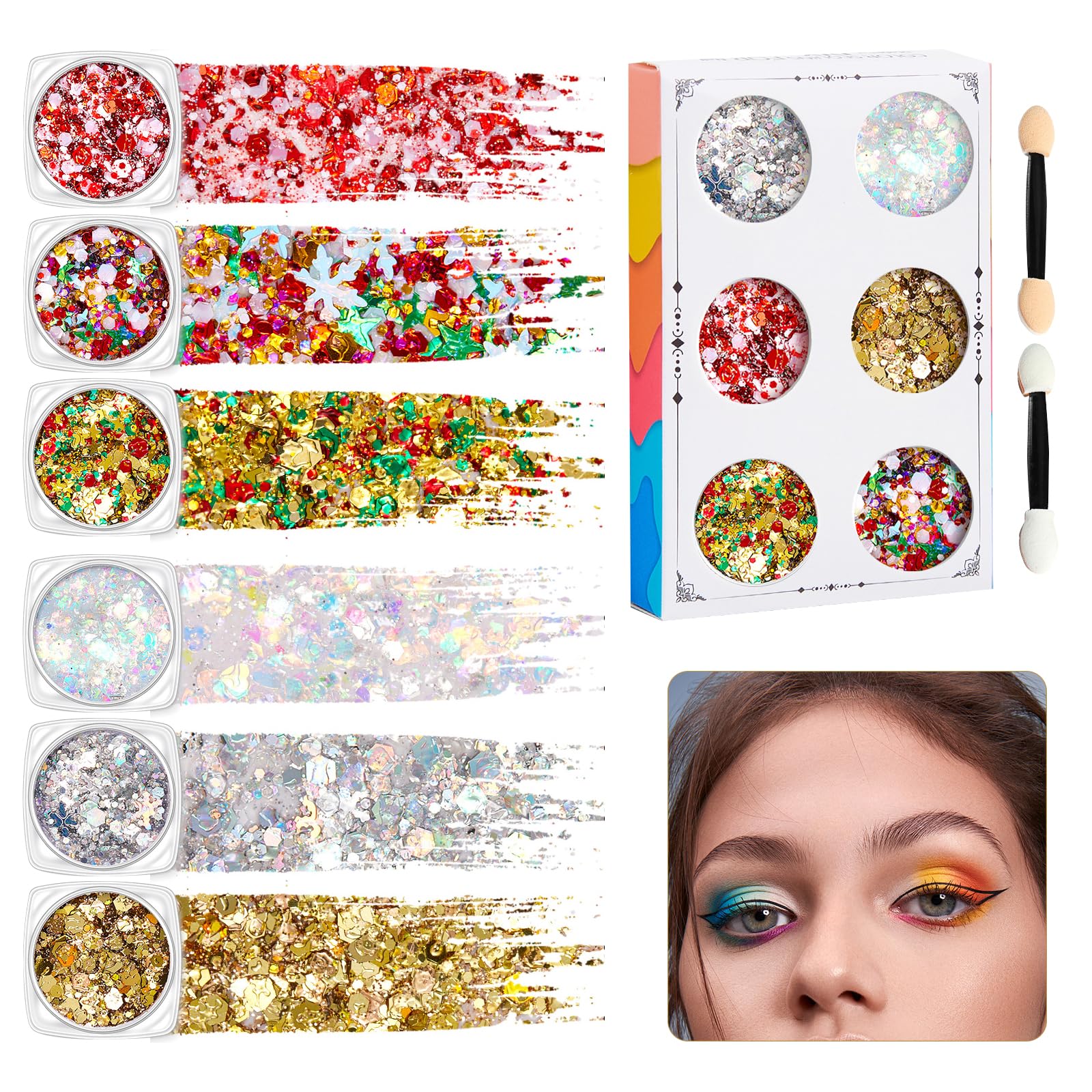 We've carefully selected six trendy, shimmering shades for you, each individually packaged in a clear case for hygienic travel. Whether paired with an elegant evening gown or a vibrant party outfit, this mini palette allows you to mix and match freely, perfectly complementing your everyday style inspiration. Multiple application scenarios: 1. Christmas parties: Halloween, Christmas, New Year's, themed parties. 2. Music festivals and celebrations: Coachella style, concerts, weddings, birthday parties. 3. Everyday accents: shimmering eyeshadow, collarbone highlighter, nail embellishment, body paint. 4. Sports entertainment: face paint for sporting events to shine bright while cheering on your team.Festive Sparkle Body glitter will make you the center of attention at Halloween, Christmas, birthday parties, theatrical performances, light festivals, and more. Suitable for use on the face, body, nails, and other areas. Add a festive touch to your look. Easy application: With a unique combination of gel and glitter, this product applies directly to the skin. There's no need to use additional makeup adhesives, simplifying your application routine. In just one swipe, the glitter adheres instantly, making body decoration simple, quick, and fun. Long-lasting adhesion: The glitter adheres firmly to the skin without coming loose. No need for frequent touch-ups: Dance, laugh, and enjoy your celebrations day and night without worry. Say goodbye to embarrassing glitter fallout and maintain a flawless look all day long. Dazzling Shine This shimmering body gel refracts light to create a dazzling, eye-catching glow in both artificial and natural light. Its bold, luminous texture instantly enhances your makeup, making you the undisputed center of attention at any party or festive gathering. Effortlessly stand out from the crowd. 6 Shimmering Shades to Choose From: This body glitter set includes 6 modern, dazzling shades, each individually packaged in elegant containers. Whether paired with everyday makeup or a glamorous evening gown, you'll effortlessly find the perfect combination to create personalized, glittery looks suitable for any occasion.Gel à paillettes lumineux pour visage et corps pour maquillage de festivalDESCRIPTION DU PRODUIT Nous avons soigneusement sélectionné six teintes brillantes à la mode pour vous, chacune emballée individuellement dans un étui transparent afin que vous puissiez l'emporter avec vous de manière hygiénique. Que ce soit avec une robe de soirée élégante ou un ensemble festif vibrant, cette mini palette vous permet de mélanger et assortir librement, complétant parfaitement votre inspiration quotidienne en matière de style. Plusieurs scénarios d'application : 1. Fêtes de Noël : Halloween, Noël, Nouvel An, fêtes à thème. 2. Festivals de musique et célébrations : style Coachella, concerts, mariages, fêtes d'anniversaire. 3. Accents quotidiens : ombre à paupières brillante, brillance de la clavicule, embellissement des ongles, peinture corporelle. 4. Animation sportive : peinture pour le visage pour les événements sportifs pour briller de sa propre lumière tout en encourageant votre équipe.Festival brillant La brillance corporelle vous rendra le centre d'attention pour Halloween, Noël, fêtes d'anniversaire, spectacles théâtraux, festivals de lumière et plus encore. Convient pour une utilisation sur le visage, le corps, les ongles et d'autres zones. Ajoutez une touche festive à votre look. Application facile : avec une combinaison unique de gel et de paillettes, ce produit s'applique directement sur la peau. Il n'est pas nécessaire d'utiliser des adhésifs de maquillage supplémentaires, ce qui simplifie votre routine d'application. En un seul passage, les paillettes adhèrent instantanément, ce qui rend la décoration du corps simple, rapide et amusante. Adhérence durable : les paillettes adhèrent fermement à la peau sans se détacher. Pas besoin de retoucher fréquemment : dansez, riez et profitez de vos célébrations de jour et de nuit sans souci. Dites adieu aux chutes de paillettes embarrassantes et gardez un look impeccable tout au long de la journée. Brillance éblouissante Ce gel pour le corps brillant réfracte la lumière pour créer un éclat éblouissant et accrocheur à la fois sous une lumière artificielle et naturelle. Sa texture audacieuse et lumineuse met instantanément en valeur votre maquillage, faisant de vous le centre d'attention incontesté de toute fête ou rassemblement festif. Démarquez-vous sans effort de la foule. 6 teintes brillantes au choix : ce lot de paillettes pour le corps comprend 6 teintes modernes et éblouissantes, chacune emballée individuellement dans des récipients élégants. Que ce soit avec un maquillage quotidien ou une robe de soirée glamour, vous trouverez sans effort la combinaison parfaite pour créer des looks personnalisés et brillants qui conviennent à toutes les occasions.