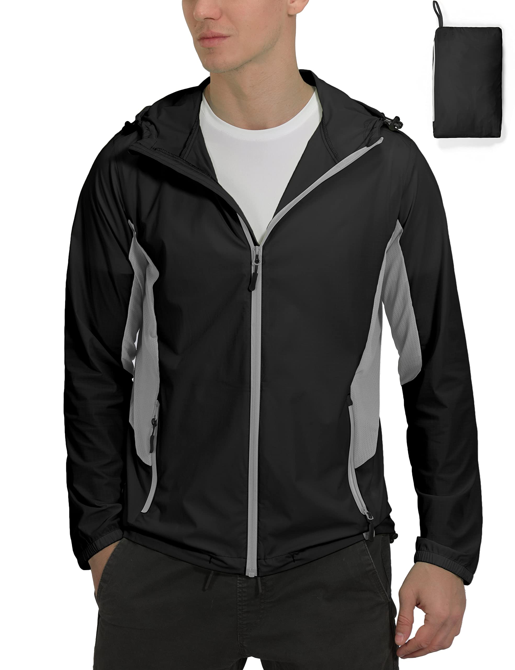 4 pockets and portable: 2 side zip pockets and 2 extra large inner pockets can be stowed in a separate right zip pocket for simple storage and travel.Breathable and reflective: Ultra-Stretch mesh on the sides and sleeve inserts are very breathable, 2 reflective strips on the back for increased visibility in poor lighting conditions.Properties: zipper at the front, elastic cuffs, side mesh panel, hoodie and hem cordely train ensure adjustable and breathable comfort.Durable nylon fabric: sun protection, fast drying, ultra light, breathable, moisturizing, 4-way stretch, water-repellent, cooling feeling, portable and portable.Sun protection: UV protection factor 50+ offers maximum protection for long hours in the sun and protects it from harmful UV rays.4 Taschen und tragbar: 2 seitliche Reißverschlusstaschen und 2 extra große Innentaschen, lässt sich in einer eigenen rechten Reißverschlusstasche für einfache Aufbewahrung und Reisen verstauen. Atmungsaktiv und reflektierend: Ultra-Stretch-Mesh an den Seiten und Ärmel-Einsätze sind sehr atmungsaktiv, 2 reflektierende Streifen auf der Rückseite für erhöhte Sichtbarkeit bei schlechten Lichtverhältnissen. Eigenschaften: Reißverschluss vorne, elastische Bündchen, seitliches Mesh-Panel, Kordelzug Hoodie und Saum sorgen für verstellbaren und atmungsaktiven Komfort. Strapazierfähiges Nylongewebe: Sonnenschutz, schnell trocknend, ultraleicht, atmungsaktiv, feuchtigkeitsableitend, 4-Wege-Stretch, wasserabweisend, kühlendes Gefühl, tragbar und tragbar. Sonnenschutz: UV-Schutzfaktor 50+ bietet maximalen Schutz für lange Stunden in der Sonne, schützt Sie vor schädlichen UV-Strahlen.Mapamyumco Atmungsaktive leichte Sommerjacke für Herren zum Laufen Radfahren, verstaubare Windjacke mit Kapuze XL Schwarz