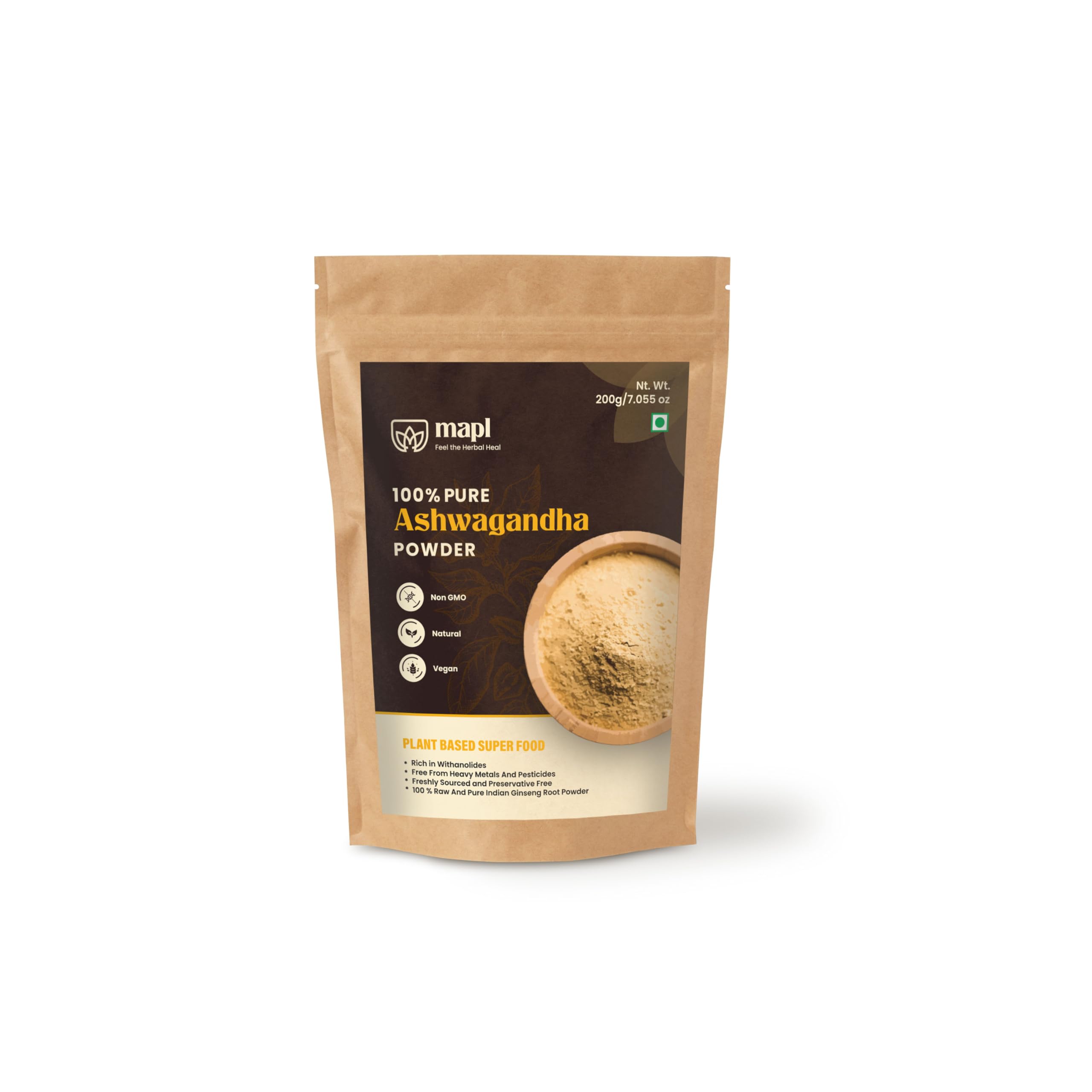 MAPL Organic Ashwagandha Powder is crafted from organically grown Ashwagandha roots, ensuring purity and potency. The finely milled powder is easy to absorb, allowing your body to fully utilize its beneficial compounds.