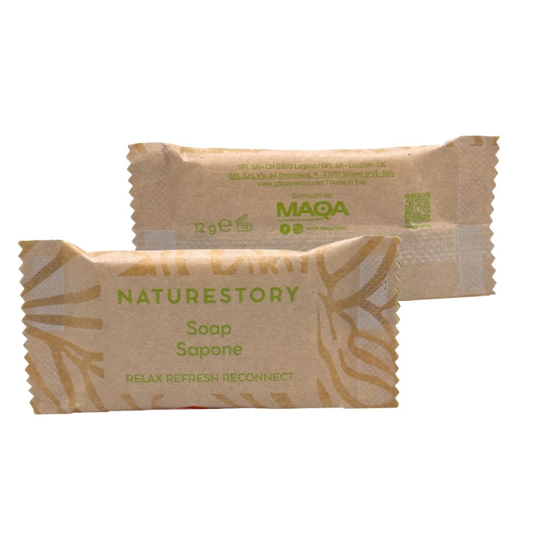 Dimensions and quantity: You will receive 100 hotel soaps of 12g each. The soap measures 3 x 5 cm and can be reused by the guest during their stay. Even after opening, it retains its quality and always guarantees a feeling of freshness and cleanliness. Thanks to the care and attention to detail and the quality of the raw materials, you will leave a lasting impression on your guests and make each stay a unique experience to remember and share. Environmentally friendly: The soaps are made with safe, effective, and naturally derived ingredients, enriched with natural botanical extracts that provide pleasant fragrances. The hand soap is packaged in convenient recyclable paper packs, the result of a responsible choice that helps reduce plastic use. For the scented soap, only gentle preservatives have been used to minimize the risk of allergies. Multifunctional: Mini soaps are used in various contexts: in accommodation establishments, they are often provided as part of the guest amenities. People who travel or go camping prefer mini soaps to save space in their luggage. 12g hand soaps are also provided by gyms and wellness centers to their members. In hospitals and healthcare facilities, single-dose soaps can be used to ensure adequate hygiene. Design: Our hotel soap is packaged in a rectangular flow pack made of recycled brown paper. Ideal for meeting all needs for practicality and comfort thanks to its 12-gram weight. When guests enter a room, the first thing they look at is the complimentary B B in the bathroom, as they like to feel pampered and cared for. They are practical for short stays and help maintain a clean and hygienic environment. Made in Italy. Fragrance: The hotel courtesy soap is ideal for daily hygiene. Its gentle, 100 plant-based formula leaves skin feeling fresh and clean. Dermatologically tested. The light floral scent of the mini soap provides a feeling of purity and well-being after use, allowing your clients or guests to snuggle up and cleanse themselves overnight.MAQA Lot de 100 mini savons parfumés 12 g, savons jetables pour ligne de courtoisie pour hôtel et B B, mini savon corpsDimensions et quantité : vous recevrez 100 savons hôtels de 12 g. Les dimensions du savon sont de 3 x 5 cm, et peut être utilisé plusieurs fois par l'hôte pendant le séjour car même s'il est ouvert, il ne perd pas de qualité et garantit toujours une sensation de fraîcheur et de nettoyage. Grâce au soin et à la recherche des détails et à la qualité des matières premières, vous laisserez une marque indélébile chez vos clients, et rendrez chaque séjour une expérience unique à mémoriser et à raconter. Respectueux de l'environnement : les savons sont fabriqués avec des ingrédients d'origine naturelle, sûrs, efficaces et enrichis en extraits botaniques naturels, qui confèrent d'agréables parfums. Le savon mains est emballé dans des packs pratiques de papier recyclable, le fruit d'un choix responsable qui contribue à réduire l'utilisation de plastique. Pour le savon parfumé, seuls des conservateurs délicats ont été utilisés pour minimiser le risque d'allergies. Multifonction : les mini savonnettes sont utilisées dans différents contextes : dans les structures d'hébergement, elles sont souvent fournies dans le cadre des équipements pour les invités. Les personnes qui voyagent ou vont en camping préfèrent des mini savons pour économiser de l'espace dans les bagages. Les savons mains de 12 g sont également fournis par les gymnases et centres de bien-être à leurs membres. Dans des milieux hospitaliers et des établissements sanitaires, les savons monodose peuvent être utilisés pour garantir une hygiène adéquate. Design : notre savon hôtel est emballé dans un flow-pack rectangulaire en papier havane recyclé. Idéal pour satisfaire tous les besoins de praticité et de confort grâce à son grammage de 12 grammes. Lorsque les invités entrent dans une chambre, la première chose qu'ils regardent est la ligne de courtoisie pour b b présente dans la salle de bain, car ils aiment se sentir gâtés et câlinés. Elles sont pratiques pour les séjours courts et contribuent à maintenir un environnement propre et hygiénique. Fabriqué en Italie. Fragrance : le savon de la ligne de courtoisie hôtel est idéal pour l'hygiène quotidienne. Sa formule délicate, 100 végétale, laisse la peau fraîche et propre. Testé sous contrôle dermatologique. Le léger parfum floral du savon mini donne une sensation de pureté et de bien-être après utilisation permettant à vos clients ou invités de se blottir et de s'assainir pendant la nuit.