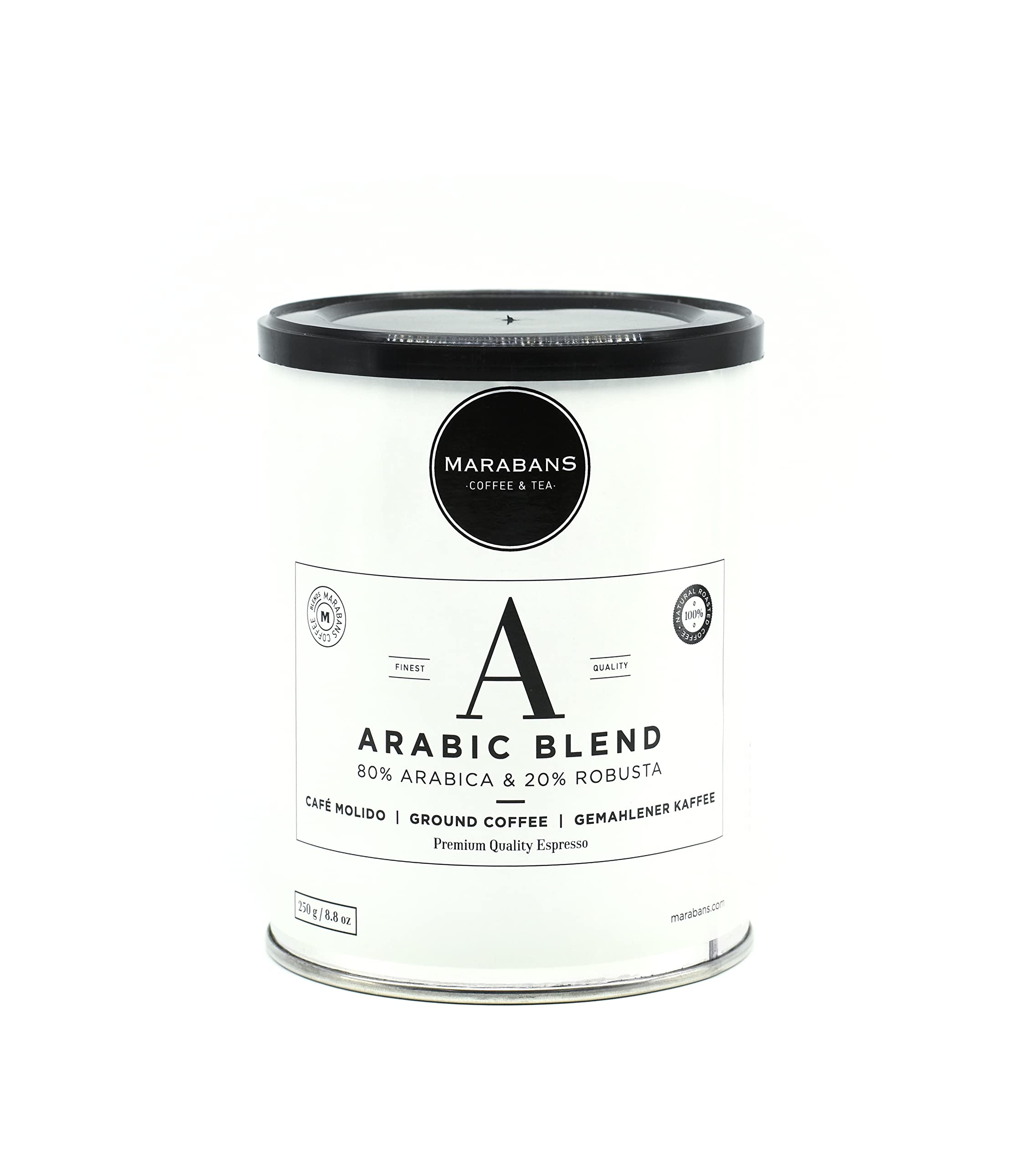 Marabans Coffee & Tea Marabans Arabic Blend Ground Coffee 80% Arabica 20% Robusta 250 gram pot classic style with fruity aromas and honey taste.