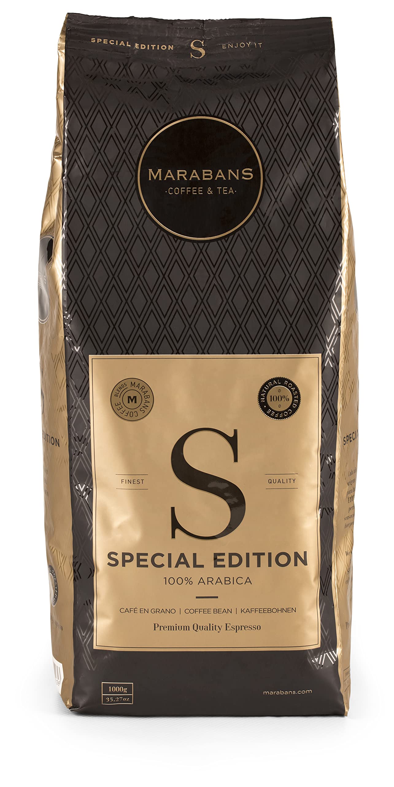 Marabans Coffee & Tea Marabans Special Edition 1kg bag of coffee beans 100% Arabica Acidity: medium/low dark hazelnut crema.