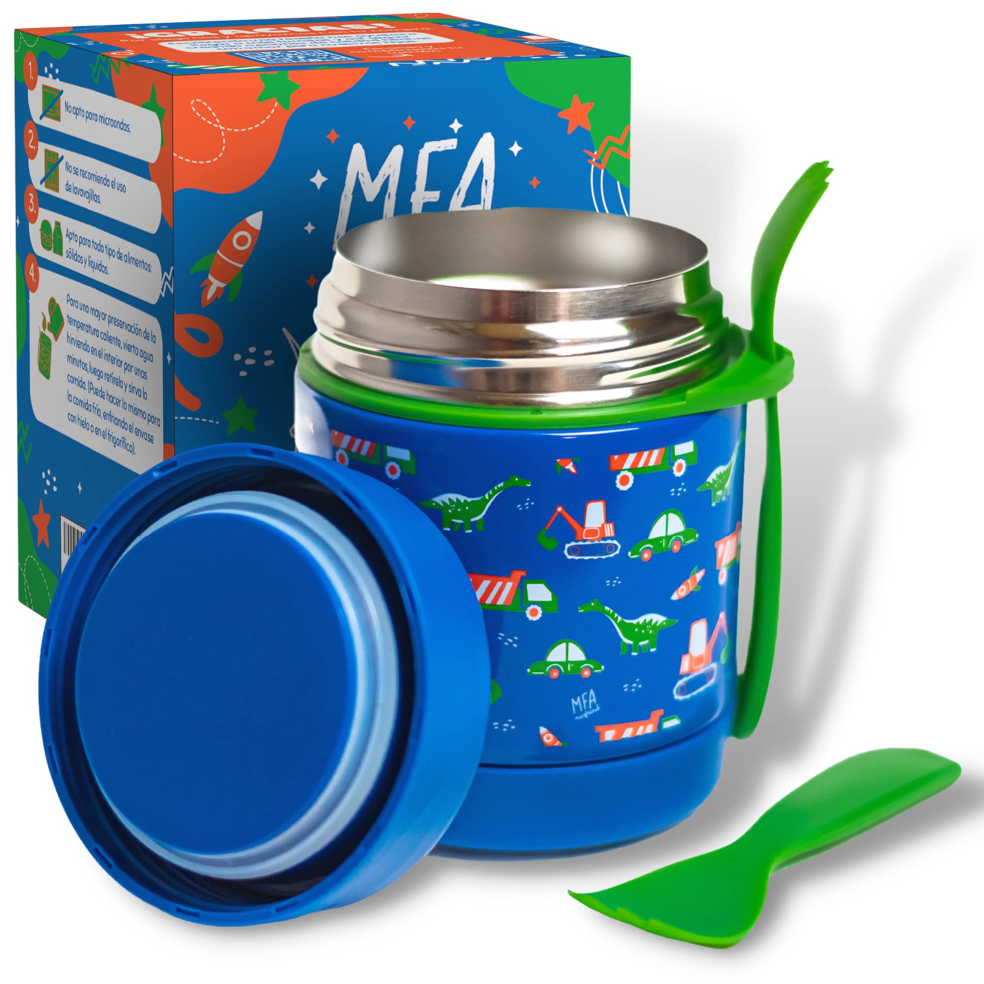 ?? The design and the topic is designed so that your child is enjoying and proud of his solid drinking bottle.In addition, an ideal gift packaging is included, in which everything is packed perfectly and delivered with great attention to detail so that you are welcome to open your gift.?? 2 spoons - fork (Spork) included in the scope of delivery if you stay in the backpack of your best friend.The cutlery is a melt of fork and spoon and is suitable for liquids and solids.The thermos can for hot dishes contain a safe bra that holds the tool while the way and is also easy for the child to take it out alone.?? The solid baby drinking bottle is robust for everyday use: the high-quality stainless steel structure is designed for handling falls, dents and daily friction of an active and playful child.Your materials are safe and BPA-free.?? The thermos for baby porridge has a capacity of 350 ml. The wide opening enables easy filling and washing and makes your child's food very easy and independent.?? The best thermos for food!Keep warm or cold: the vacuum insulation technology, the completely airtight screw lid and the insulating rubber floor keep the temperature of meals warm (7 hours) or cold (5 hours) The insulating basis prevents water from getting between the walls when washed it.