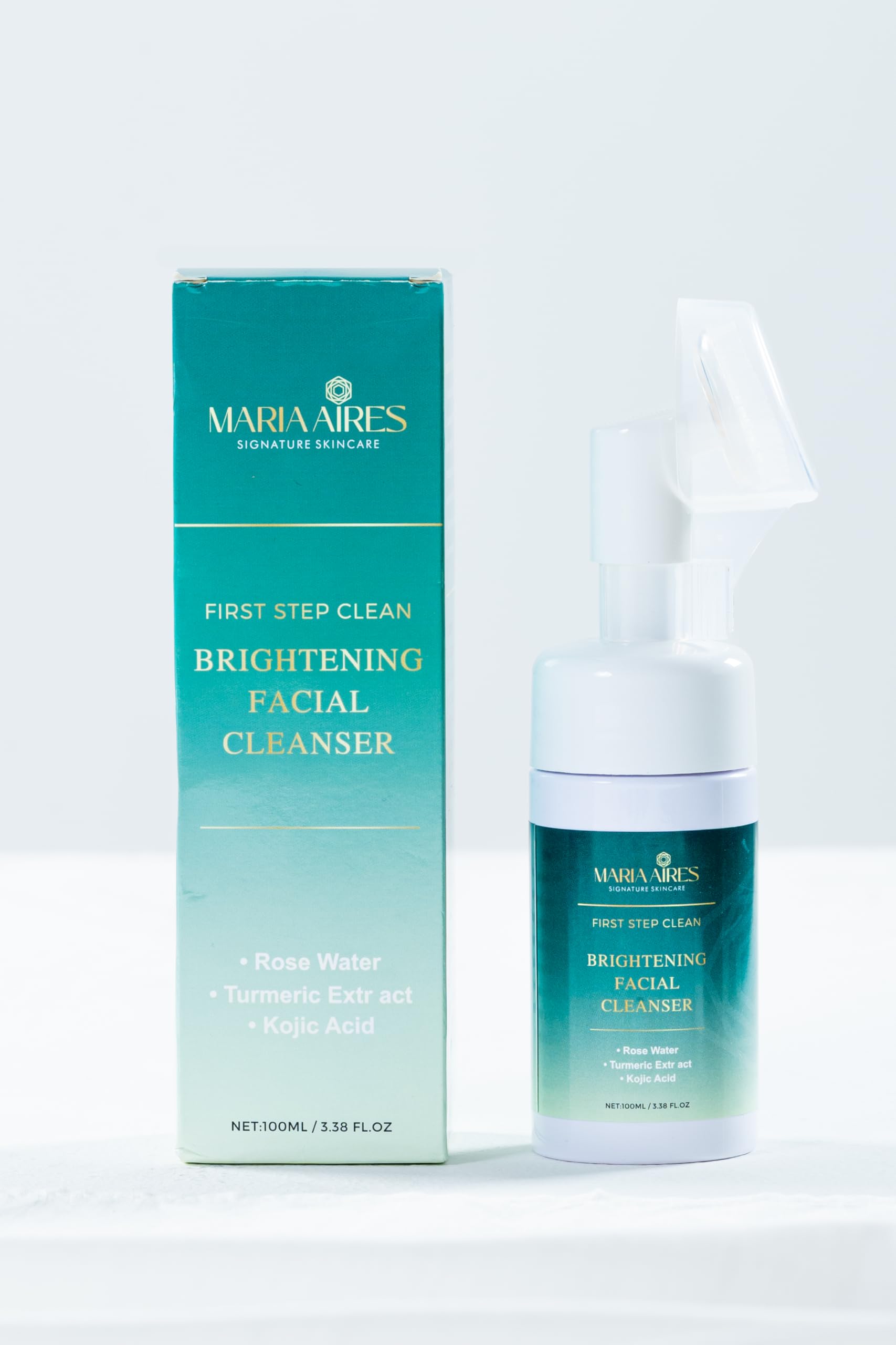 Transform your skincare routine with this luxurious Brightening Facial Cleanser from Maria Aires Signature Skincare. This innovative formula combines the gentle purifying properties of rose water with the brightening power of turmeric extract and kojic acid. The convenient foam dispenser delivers the perfect amount of product with each use, while the specialized brush head helps to gently exfoliate and cleanse. This 3.38 fl. oz bottle contains a concentrated formula that helps reveal brighter, clearer-looking skin. The cleanser's unique blend of ingredients works to remove impurities while maintaining skin's natural moisture balance. Perfect for daily use, this first-step clean product preps your skin for the rest of your skincare routine. The elegant green packaging reflects the premium quality of this facial cleanser, making it a sophisticated addition to your bathroom counter.