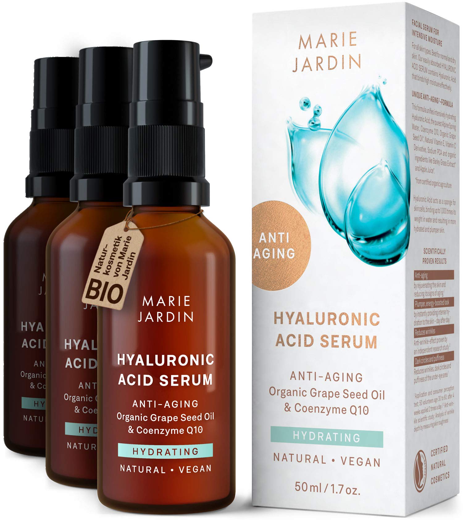 How to use Marie Jardin Hyaluronic Acid Serum? Contents: Apply 1-2 pumps of Hyaluronic Serum twice a day (morning and evening) to the entire face and neck. Ideal as a base for: Daily makeup. A day or night cream. An anti-wrinkle cream. Our hyaluronic acid serum has the greatest anti-aging effect on forehead wrinkles and dark circles. 100 certified natural cosmetics. Only entirely vegan and natural ingredients make their way into our highly concentrated hyaluronic acid serum (face serum). Pure Alpine spring water serves as the base. Q10, organic grape seed oil, and apple juice. Vitamin C for better skin absorption. Natural extracts of dandelion root and barley. The exact ingredients are listed on the back of the packaging. Contents: Hyaluronic acid is produced by our bodies and is essential for the firmness and elasticity of our connective tissues and skin. As we age, our bodies produce less hyaluronic acid. To prevent this reserve from being completely depleted, it is essential to replenish it as early as possible, for example, with a hyaluronic acid serum to preserve our youthful, fresh skin. The anti-aging effect of our hyaluronic acid serum has been verified and scientifically proven. The plumping effect not only reduces wrinkles but also helps eliminate dark circles. The vitamin C it contains ensures optimal absorption by the skin. INGREDIENTS Aqua, Pyrus Communis Fruit Juice (organic apple juice) , Vitis Vinifera Seed Oil (grape seed oil), dicaprylyl ether, glycerin, glyceryl stearate citrate, Taraxacum Officinale Root Extract (dandelion extract), xanthan gum, cetearyl glycosides, Wheat Straw Dice stearoyl glutamate, cetearyl alcohol, glyceryl caprylate, sodium levulinate, PCA, levulinic acid, parfum , Hordeum vulgare extract (organic barley extract) , Chondrus crispus, p-anisic acid, citric acid, sodium hyaluronate (hyaluronic acid), Ascorbyl Gluco. Coside (vitamin C), sodium hydroxide, ubiquinone (coenzyme Q10), sodium anisate, Leontopodium Alpinum Flower Leaf Extract (organic protein extract) , sodium phytates, tocopherol (vitamin E), Helianthus Annuus Seed Oil (sunflower oil), sodium benzoate, potassium sorbate, lites Monene , linalool , citral , citronellol . from certified organic farming (kbA) Natural fragrance DIRECTIONS FOR USE For intensive care after cleansing, apply and distribute a small amount of serum onto the skin (on the face and, if necessary, décolleté). If needed, follow with a night cream. For daytime use, combine optimally with a day cream (with UV protection). See more✓ Money-back guarantee: Order risk-free from Marie Jardin. If you are not satisfied with our products, you will receive your money back immediately, because your satisfaction is our priority. Order our hyaluronic serum now and experience our quality for yourself. 100 FREE OF: hormones, parabens, silicone, and microplastics. Our hyaluronic serum is vegan and guaranteed cruelty-free. Non-GMO. Suitable for all skin types: Suitable for sensitive, combination, and even sensitive skin. Can be combined with a day or night cream or an anti-wrinkle cream. Certified ingredients: Hyaluronic acid, vitamin C, Q10, grapeseed oil, etc., provide essential nutrients for healthy, smooth skin. Anti-aging effect: The anti-wrinkle effect of our hyaluronic acid serum is scientifically proven. It provides fresher-looking skin and also helps reduce dark circles.Lot de 3 sérums à l'acide hyaluronique avec vitamine C et Q10 - Hautement dosés - 150 ml - Avec complexe anti-âge testé 5 fois - Base de maquillage - 3 x 50 mlDESCRIPTION DU PRODUIT DESCRIPTION DU PRODUIT Comment utiliser le sérum à l'acide hyaluronique de Marie Jardin ? Contenu : Appliquer deux fois par jour (matin et soir) 1-2 pressions du sérum Hyaluron sur l'ensemble du visage et du cou. Idéal comme base pour : Le maquillage quotidien. Une crème de jour ou de nuit. Une crème anti-rides. Notre sérum à l'acide hyaloronique a le plus grand effet anti-âge sur les rides du front et les cernes. 100 cosmétique naturel certifié. Seuls des ingrédients entièrement végétaliens et naturels trouvent le chemin dans notre sérum à l'acide hyaloronique hautement dosé (sérum visage). L'eau de source pure d'Alpines sert de base. Q10, huile de pépins de raisin bio et jus de pomme. Vitamine C pour une meilleure absorption de la peau. Extraits naturels de racine de pissenlit et d'orge. Les ingrédients exacts sont lus au dos de l'emballage. Contenu de la livraison : L'acide hyaluronique est fabriqué par notre corps et est essentiel pour la fermeté et l'élasticité de nos tissus conjonctifs ou de notre peau. Plus on vieillit, moins il y a de fortes doses d'acide hyaluronique, notre corps peut produire lui-même. Pour ne pas vider complètement cette mémoire, il est essentiel que nous ajoutions à notre corps le plus tôt possible, par exemple avec un sérum d'acide hyaluronique pour préserver notre jeune peau fraîche. L'effet anti-âge de notre sérum à l'acide hyaloronique a été vérifié et scientifiquement prouvé. L'effet repulpant n'a pas seulement un effet anti-rides, mais aide également à éliminer les cernes. La vitamine C contenue assure la meilleure absorption possible de la peau. INGRÉDIENTS Aqua, Pyrus Communis Fruit Juice (jus de pomme biologique) , Vitis Vinifera Seed Oil (huile de pépins de raisin), dicaprylyl eter, glycérine, citrate de stéarate de glycérol, Taraxacum Officinale Root Extract (extrait de pissenlit), gomme de xanthane, glycosides cétéaryl Wheat Straw Dice stéaroyl glutamate, cétéaryl alcohol, glycéryl caprylate, lévulinate de sodium, PCA, acide lévulinique, parfum , extrait de Hordeum vulgare (extrait d'orge biologique) , Chondrus crispus, acide p-anisique, acide citrique, hyaluronate de sodium (acide hyaluronique), Ascorbyl Gluco. coside (vitamine C), hydroxyde de sodium, ubiquinone (coenzyme Q10), anisate de sodium, Leontopodium Alpinum Flower Leaf Extrait (extrait de protéines biologiques) , phy