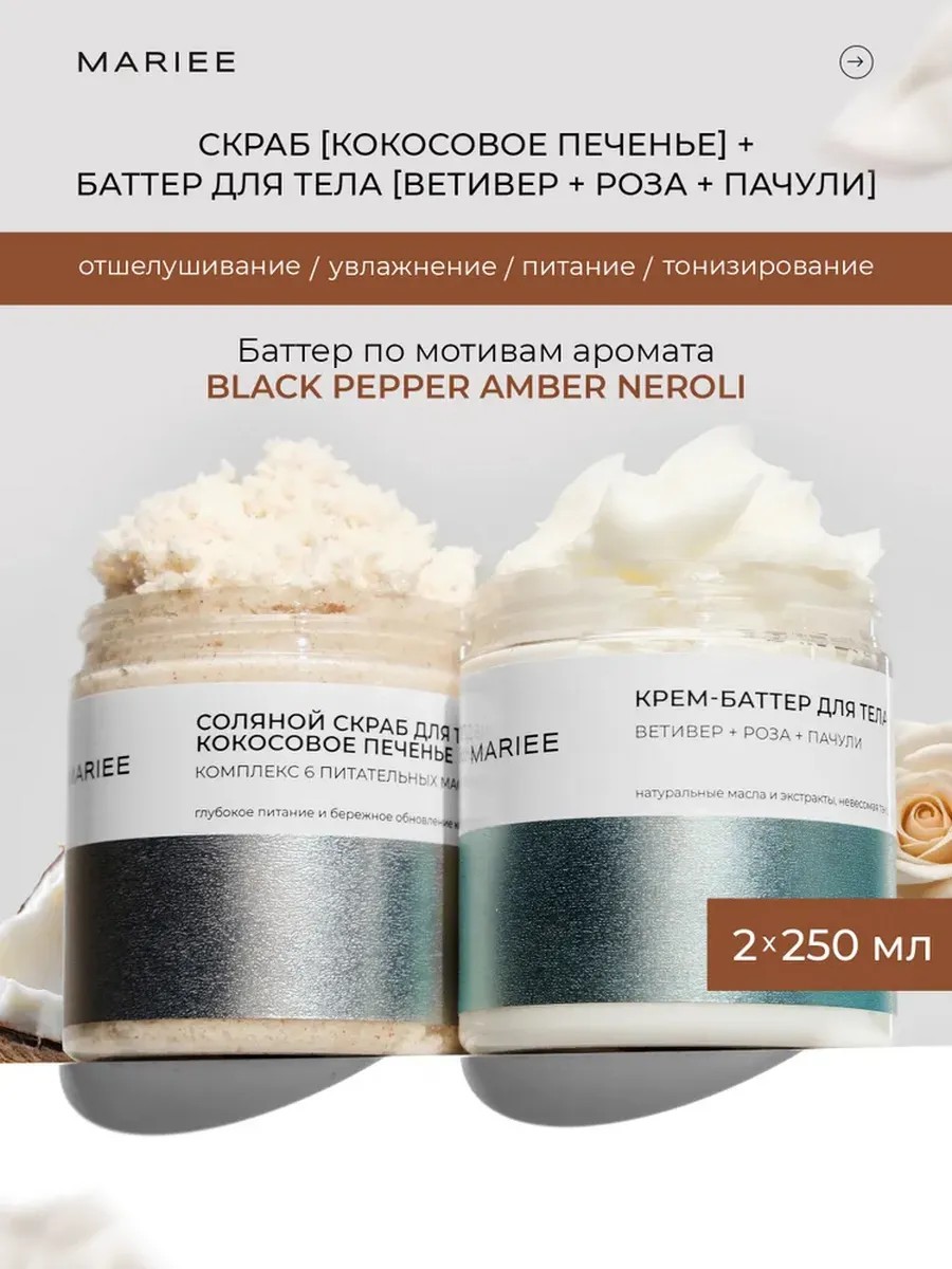 | Комплектация | Баттер для тела с ароматом ветивера 250г - 1шт; Скраб для тела с ароматом кокоса 250г - 1шт |