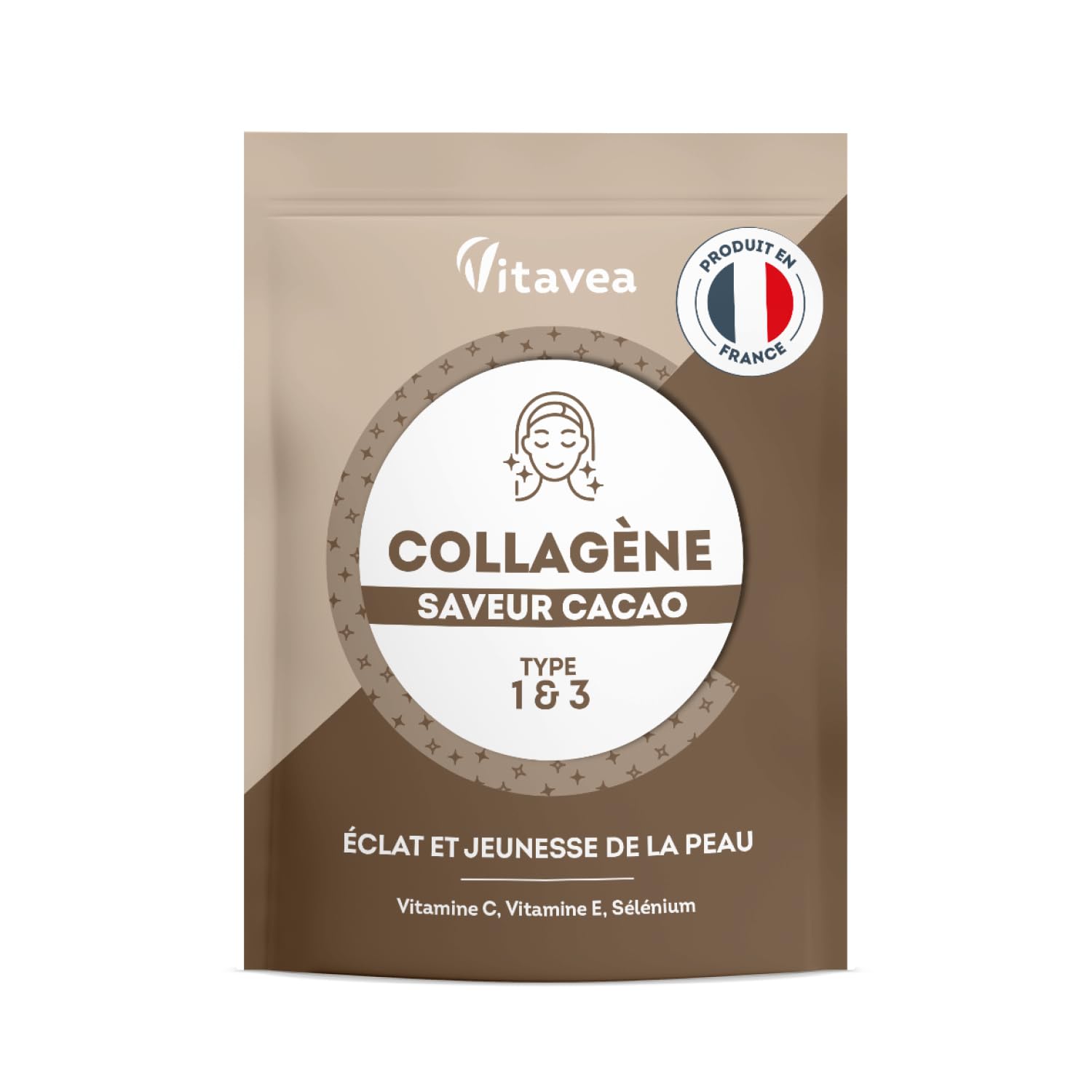 Food supplement based on collagen hydrolyzate, vitamins C and E and selenium with sweeteners. Product details: The VITAVEA COCOA FLAVOR COLLAGEN formula is your ally to promote radiance and youthfulness of the skin. Collagen is a protein naturally present in our body. With age, collagen production decreases and deteriorates. Our VITAVEA COCOA FLAVOR COLLAGEN formula is a complete food supplement enriched with vitamin C to participate in the normal formation of collagen and ensure the normal function of the skin. About Vitavea:Vitavea, specialist in natural well-being, offers you a wide range of products to take care of you. We are committed to supporting you in your well-being process and enabling you to find the product that meets your needs. Accessible to all, easy to use, our products fit ideally into your daily life. All our products are made in France, guaranteeing you quality and respect for manufacturing processes. With Vitavea, well-being and health are within reach! Ingredients: Marine (fish) collagen hydrolyzate low-fat cocoa powder vitamin C natural vanilla flavor mineral: sodium selenite vitamin E natural flavor sweetener: steviol glycosides medium chain triglycerides. May contain traces of: gluten, soy, milk, nuts, celery and eggs. Active content for 1 measuring spoon (5g): Vitamin E: 6 mg (50 VNR ) Vitamin C: 80 mg (100 VNR ) Selenium: 27.5µg (50 VNR ) Marine collagen hydrolyzate: 2,500 mg Directions for use: Dilute a measuring spoon (5g) in a glass of water (150ml) once a day. To consume quickly after preparation. Precautions for use: Do not exceed the recommended daily dose. To be consumed as part of a varied and balanced diet and a healthy lifestyle. Keep out of reach of children. Not recommended for children under 3 years old. INGREDIENTS Marine (fish) collagen hydrolyzate low-fat cocoa powder vitamin C natural vanilla flavor mineral: sodium selenite vitamin E natural flavor sweetener: steviol glycosides medium chain triglycerides. May contain traces of: GLUTEN, SOY, MILK, NUTS, CELERY and EGGS. DIRECTIONS FOR USE Do not exceed the recommended daily dose. To be consumed as part of a varied and balanced diet and a healthy lifestyle. Keep out of reach of children. Not recommended for children under 3 years old. SAFETY WARNING Do not exceed the recommended daily dose. To be consumed as part of a varied and balanced diet and a healthy lifestyle. Keep out of reach of children. Not recommended for children under 3 years old. FRENCH MADE: Developed by micronutrition experts, this Marine Collagen powder food supplement is manufactured in France according to strict and controlled protocols and standards, guaranteeing impeccable quality. USE: Dilute a 5g measuring spoon of our Cocoa Flavor Marine Collagen powder in a 150ml glass of water, once a day. For an even more indulgent experience, you can also mix the marine collagen powder into a smoothie!. ENHANCED EFFECTIVENESS: Our collagen powder with a delicious cocoa flavor provides the necessary elements for youthful and plump skin. The synergy of vitamin C, vitamin E and selenium reinforces the effectiveness of the formula. SKIN BEAUTY FORMULA: Collagen is a protein naturally present in the body and which, with age, decreases and deteriorates. Our formula of collagen powder type 1 and 3, enriched with Vitamin C, Vitamin E and Selenium, ensures normal skin function and participates in the formation of natural collagen. MARINE COLLAGEN TYPE 1 3: Our Vitavea Cocoa Flavor Collagen food supplement is the ideal formula for smooth and radiant skin. It is enriched with Vitamin C and E, which contribute to normal collagen formation, ensure normal skin function and protect cells against oxidative stress. Complément alimentaire à base d'hydrolysat de collagène, de vitamines C et E et de sélénium avec édulcorants. Détail du produit :La formule COLLAGENE SAVEUR CACAO VITAVEA est votre alliée pour favoriser l'éclat et la jeunesse de la peau.Le collagène est une protéine naturellement présente dans notre organisme. Avec l'âge, la production de collagène diminue et se détériore.Notre formule COLLAGENE SAVEUR CACAO VITAVEA est un complément alimentaire complet enrichi en vitamine C pour participer à la formation normale de collagène et assurer la fonction normale de la peau. A propos de Vitavea :Vitavea, spécialiste du bien-être au naturel, vous propose une large gamme de produits pour prendre soin de vous. Nous avons à cœur de vous accompagner dans votre démarche bien-être et de vous permettre de trouver le produit qui répond à vos besoins. Accessibles à tous, faciles d'utilisation, nos produits s'intègrent idéalement dans votre vie quotidienne. Tous nos produits sont fabriqués en France, vous garantissant qualité et respect des processus de fabrication. Avec Vitavea, le bien-être et la santé sont à portée de main ! Ingrédients : Hydrolysat de collagène marin (poisson) cacao maigre en poudre vitamine C arôme naturel de vanille minéral : sélénite de sodium vitamine E arôme naturel édulcorant : glycosides de stéviol triglycérides à chaîne moyenne. Peut contenir des traces de : gluten, soja, lait, fruits à coques, céleri et œufs. Teneur en actifs pour 1 cuillère doseuse (5g) :Vitamine E : 6mg (50 VNR )Vitamine C : 80mg (100 VNR )Sélénium : 27.5µg (50 VNR )Hydrolysat de collagène marin : 2 500mg Conseils d'utilisation : Diluer une cuillère doseuse (5g) dans un verre d'eau (150 ml) une fois par jour. À consommer rapidement après préparation. Précautions d'emploi : Ne pas dépasser la dose journalière recommandée. À consommer dans le cadre d'une alimentation variée et équilibrée et d'un mode de vie sain. Garder hors de portée des enfants. Déconseillé aux enfants de moins de 3 ans. INGRÉDIENTS Hydrolysat de collagène marin (poisson) cacao maigre en poudre vitamine C arôme naturel de vanille minéral : sélénite de sodium vitamine E arôme naturel édulcorant : glycosides de sté