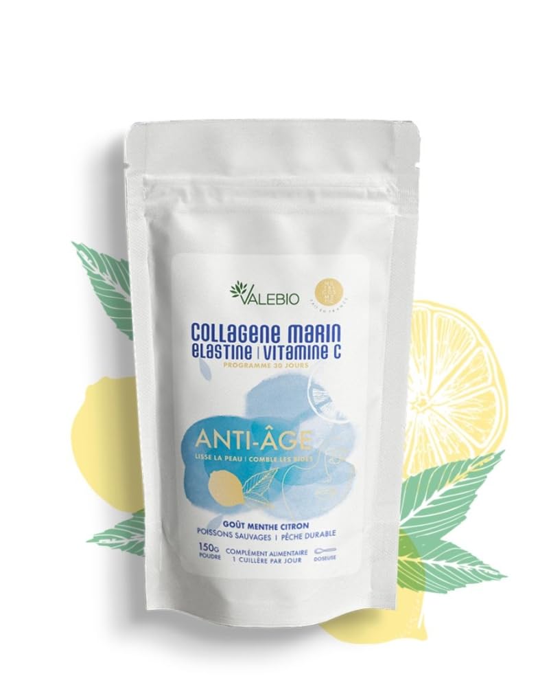 1 MONTH TREATMENT, MINT-LEMON FLAVOR: Take one measuring spoon per day. We recommend taking 3 months, then taking at least a one-month break from each treatment. MADE IN FRANCE from high-quality raw materials using a state-of-the-art enzymatic process. This food supplement is guaranteed GMO-free, CMR-free, PBT-free, pesticide-free, and titanium dioxide-free. ? CLINICALLY PROVEN EFFECT: We have selected low molecular weight hydrolyzed wild fish for optimal absorption. Our clinical study showed a 19 reduction in wrinkles in 28 days (one measuring spoon per day). ECO-RESPONSIBLE PRODUCTS: Collagen and elastin are sourced from wild fish and certified sustainable fishing, combined with natural vitamin C. THE EFFECTIVENESS OF COLLAGEN COMBINED WITH ELASTIN AND VITAMIN C: Collagen strengthens skin structure, elastin contributes to skin suppleness, while vitamin C promotes collagen production and protects the skin against free radicals. Together, these elements delay the skin aging process. ? SMOOTH AND PLUMPED SKIN: By compensating for age-related collagen loss, Valebio Marine Collagen Powder helps improve skin elasticity, reducing the appearance of wrinkles and providing essential hydration for a more youthful and revitalized appearance.CURE 1 MOIS, GOÛT MENTHE-CITRON : Prenez une cuillère doseuse par jour. Nous vous recommandons de faire 3 mois, puis faire au moins un mois de pause en chaque cure. FABRIQUÉ EN FRANCE à partir de matières premières de haute qualité par l'intermédiaire d'un processus enzymatique à la pointe de la technologie. Ce complément alimentaire est garanti sans OGM, sans CMR et PBT, sans pesticides et sans dioxyde de titane. ? EFFET CLINIQUEMENT PROUVÉ : Nous avons sélectionné des poissons sauvages hydrolysés de faible poids moléculaire pour une absorption optimale. Notre étude clinique a montré -19 de rides en 28 jours (une cuillère doseuse par jour). PRODUITS ECORESPONSABLES : Le collagène et l'elastine sont issus de poissons sauvages et certifiés pêche durable, associé à de la vitamine C naturelle. L'EFFICACITÉ DU COLLAGENE ASSOCIÉ A L'ÉLASTINE ET LA VITAMINE C : Le collagène renforce la structure cutanée, l'élastine contribue à la souplesse de la peau, tandis que la vitamine C favorise la production de collagène et protège la peau contre les radicaux libres. Ensemble, ces éléments retardent le processus de vieillissement cutané. ? UNE PEAU LISSE ET REPULPÉE : En compensant les pertes de collagène liées à l'âge, le collagène marin poudre Valebio contribue à améliorer l'élasticité de la peau, réduisant ainsi l'apparence des rides et apportant une hydratation essentielle pour une apparence plus jeune et revitalisée.