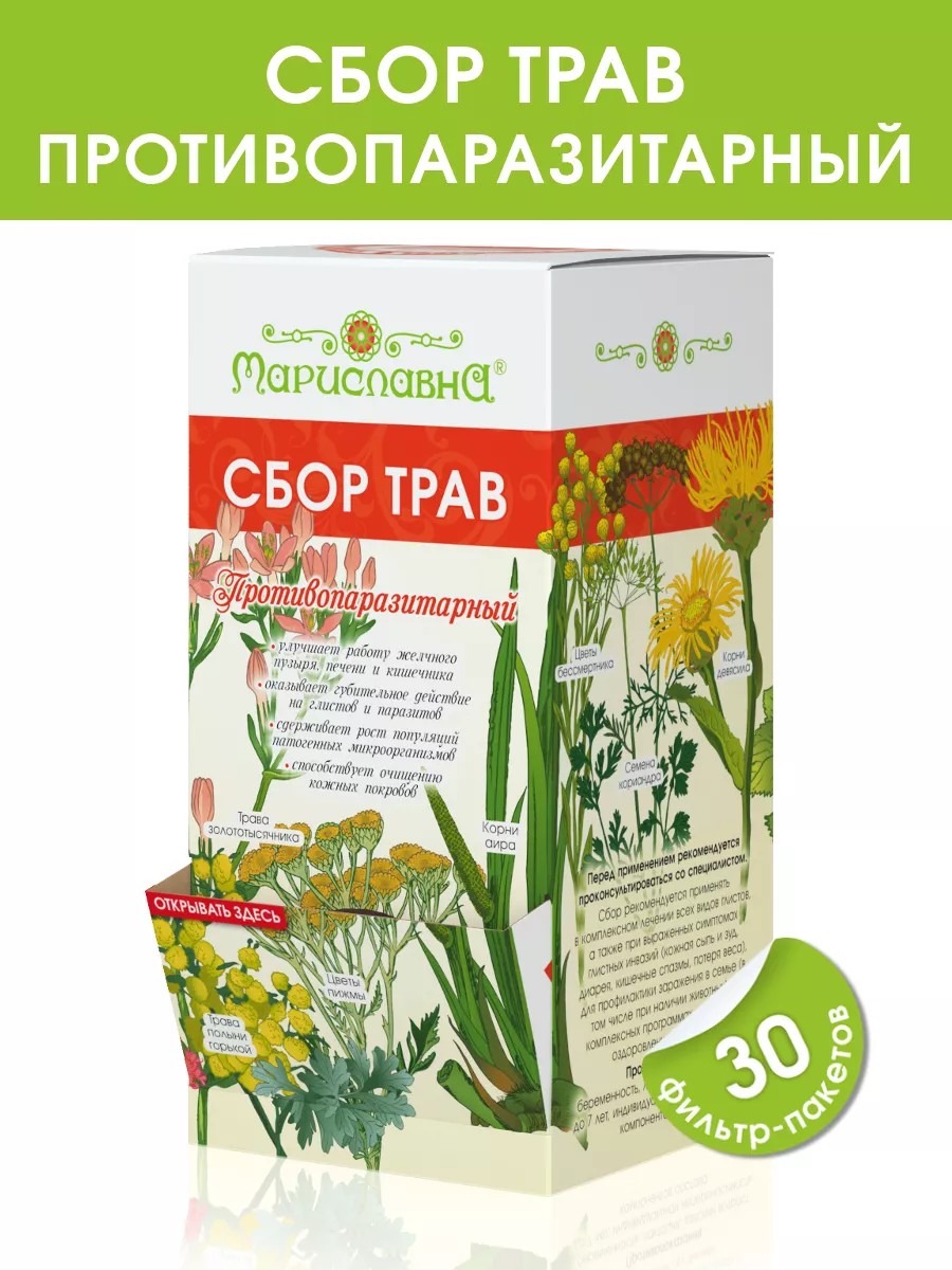 Сбор трав "Противопаразитарный" рекомендуется в комплексных схемах при паразитарных заболеваниях, вызванных различными возбудителями. Состав: корни аира, корни дeвясилa, цветы пижмы, лист перечной мяты, лист эвкалипта, трава пoлыни горькой, трава чабреца, трава репешка, трава золототысячника, корни одуванчика, семена кориандра, цветы бессмертника. Компоненты сбора оказывают комплексное воздействие в отношении протозойных инфекций, глистов и их личинок. Алкалоиды и горечи приводят к гибели паразитов, вызывая у них нарушение обменных процессов. Тимол и другие фракции эфирных масел вызывают поражение нервной системы и паралич червей. Танины способствуют истончению защитной оболочки глистов и растворению личинок. Также травы обладают желчегонным, кровоочистительным, противовоспалительным действием, улучшают работу ЖКТ и оказывают комплексное оздоравливающее воздействие на весь организм. Рецепт приготовления указан на упаковке. Курс 2 недели, оптимально проводить 2-3 курса в год. Сбор трав имеет горький вкус, это следует учитывать при покупке. Рекомендуется сочетать приём сбора в комплексе с маслом чёрного тмина арт.58938815, "Тыквенным" масляным бальзамом арт.64224201 и применением фитосвечей №13 арт.66672489. Сбор в пакетиках удобно брать на работу, в поездки, можно подарить близким. Противопоказания: беременность, лактация, детский возраст до 7 лет, индивидуальная непереносимость компонентов. Удобная форма в фильтр-пакетах и фирменная коробочка с откидным окошком упростят процесс хранения, дозирования, заваривания и процеживания.