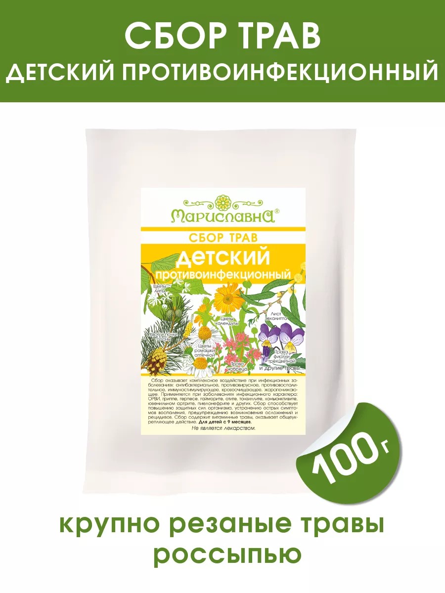 Сбор трав "Детский противоинфекционный" предназначен для детей с 9 месяцев при бактериальных и вирусных инфекциях носоглотки, бронхолёгочной системы, мочевыводящих путей, желудочно-кишечного тракта, лимфатической системы, суставов. Состав: трава буквицы, трава чабреца, трава фиалки, лист ежевики, лист малины, лист эвкалипта, плоды шиповника, хвоя и почки сосны, цветы чёрной бyзины, цветы липы, цветы ромашки аптечной, цветы календулы. Компоненты сбора оказывают антибактериальное, противовоспалительное, детоксикационное, отхаркивающее, иммуностимулирующее действие. Травяной сбор необходим при ОРВИ, гриппе, герпесе, насморке, гайморите, отите, тонзиллите, конъюнктивите, ювенильном артрите, пиелонефрите, кишечных инфекциях. Курс 2-4 недели или дольше в зависимости от заболевания. Сбор не содержит горьких трав, очень приятный на вкус и ароматный. Сбор следует заваривать по рецепту, указанному на упаковке. По желанию в настой сбора можно добавить мёд. Упаковка содержит 100 грамм травяной смеси россыпью, которой хватит примерно на 10-14 дней. На обороте бумажного пакета нанесена информация о составе и приготовлении. Противопоказания: индивидуальная непереносимость компонентов состава.