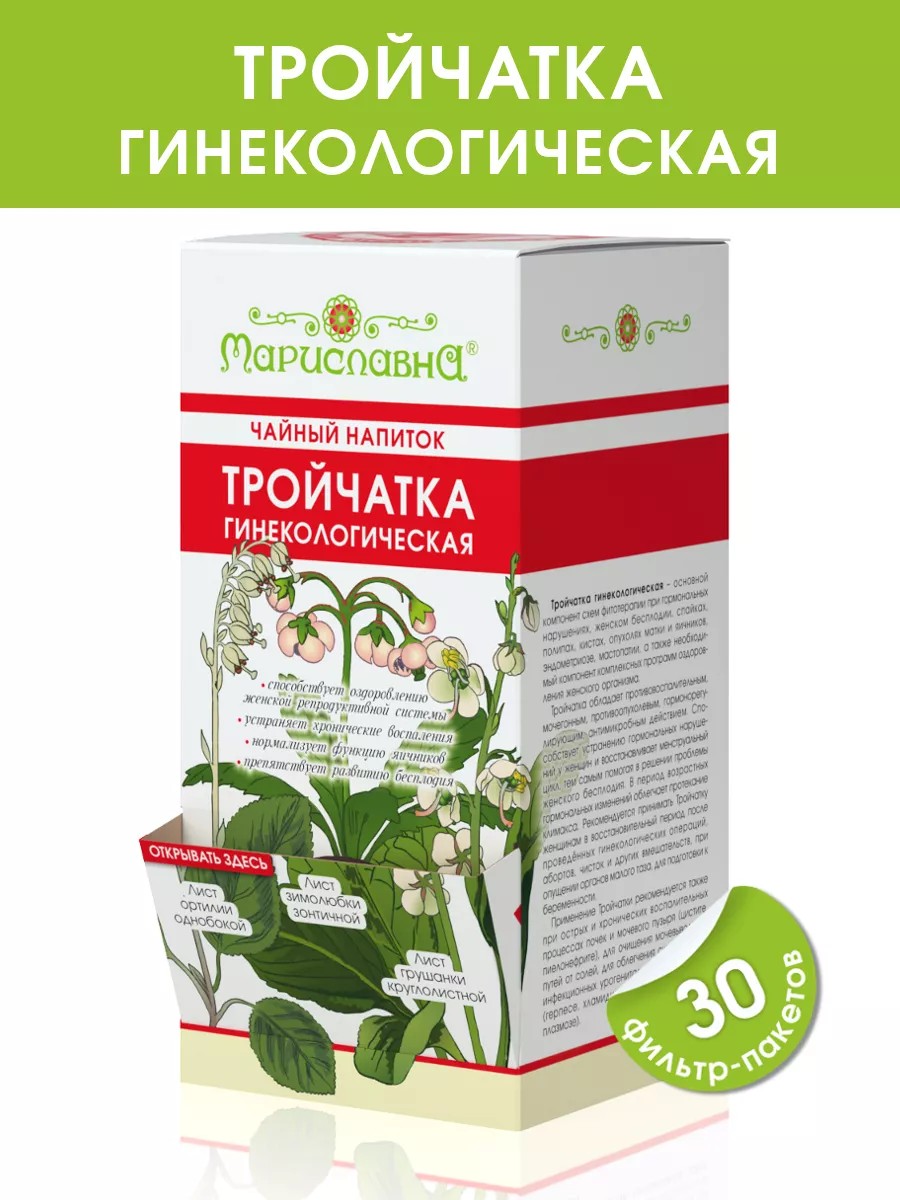 Сбор для женщин "Тройчатка гинекологическая" из трёх лекарственных трав: боровая матка (ортилия), грушанка круглолистная, зимолюбка зонтичная. Сбор рекомендуется при гормональных нарушениях у женщин, нерегулярном менструальном цикле, женском бесплодии, ПМС, кистах матки и яичников, эрозии шейки матки, аднексите, эндометрите, цистите, эндометриозе, мастопатии, а также в комплексных программах оздоровления женского организма и для подготовки к беременности. Тройчатка способствует эффективному оздоровлению органов женской репродуктивной системы, оказывает выраженное противовоспалительное действие, подготавливает к беременности, нормализует менструальный цикл. Курс 2-3 месяца. Способ применения указан на упаковке. Можно проводить несколько курсов в зависимости от исходной проблемы. Можно совмещать с другими сборами трав, тампонами, фитосвечами. Противопоказания: беременность, индивидуальная непереносимость компонентов состава. Не рекомендуется применять в случае кровотечений и в период чрезмерно обильных менструаций. Фиточай в пакетиках удобно брать на работу, в поездки, можно подарить близким. При приёме сбора 2 раза в день 1 упаковки хватит на 2 недели. Курс составляет 2-3 месяца в зависимости от имеющихся заболеваний. Чай имеет травяной вкус и аромат. Удобная форма в фильтр-пакетах и фирменная коробочка с откидным окошком упростят процесс хранения, дозирования, заваривания и процеживания.
